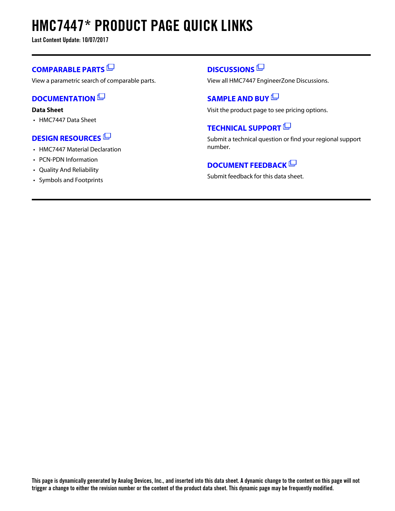 HMC7447* PRODUCT PAGE QUICK LINKS Last Content Update: 10/07/2017COMPARABLE PARTSDISCUSSIONS View a parametric search of comparable parts. View all HMC7447 EngineerZone Discussions. DOCUMENTATIONSAMPLE AND BUYData Sheet Visit the product page to see pricing options. • HMC7447 Data Sheet TECHNICAL SUPPORTDESIGN RESOURCES Submit a technical question or find your regional support • HMC7447 Material Declaration number. • PCN-PDN Information DOCUMENT FEEDBACK • Quality And Reliability Submit feedback for this data sheet. • Symbols and Footprints This page is dynamically generated by Analog Devices, Inc., and inserted into this data sheet. A dynamic change to the content on this page will not trigger a change to either the revision number or the content of the product data sheet. This dynamic page may be frequently modified.