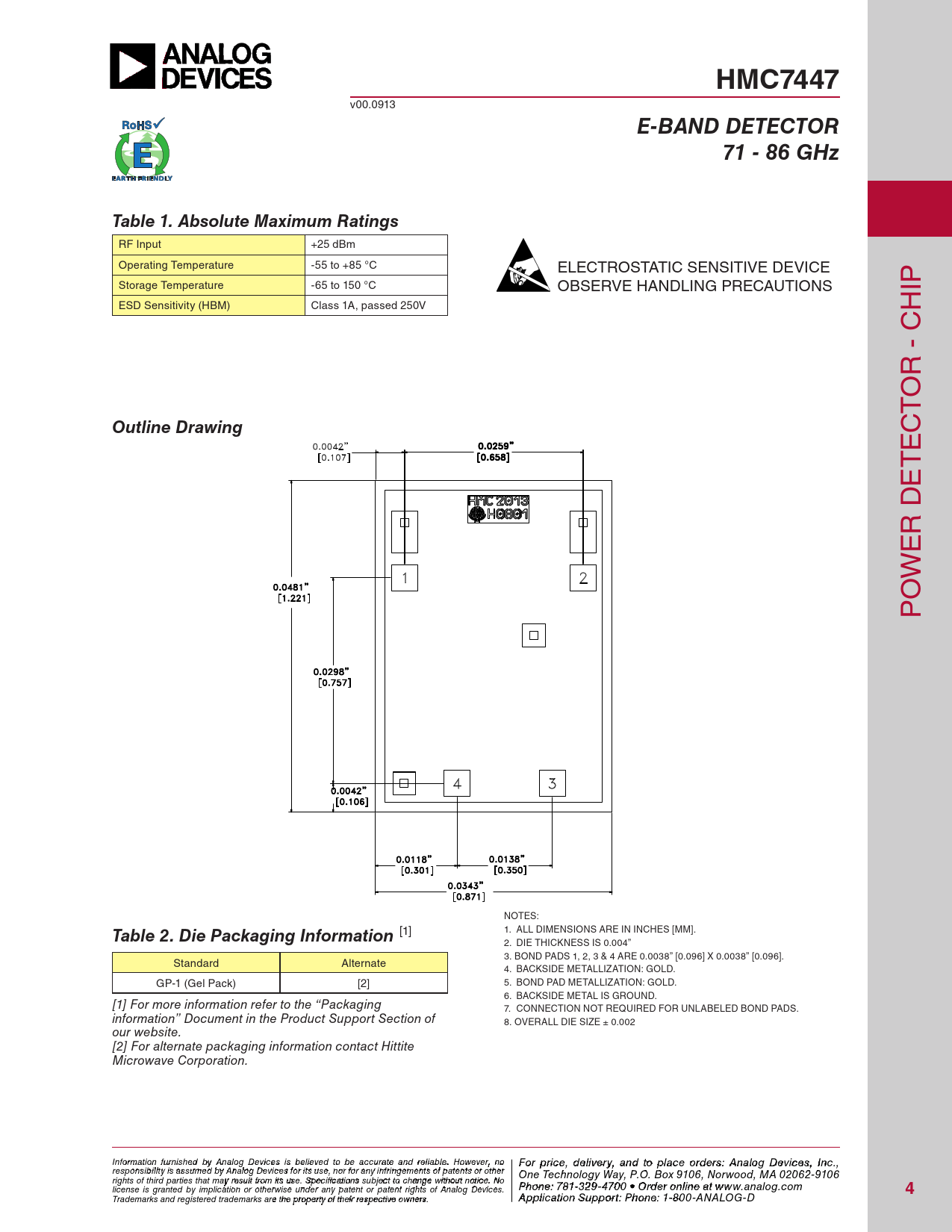 HMC7447 v00.0913 E-BAND DETECTOR71 - 86 GHzTable 1. Absolute Maximum Ratings RF Input +25 dBm Operating Temperature -55 to +85 °C ELECTROSTATIC SENSITIVE DEVICE Storage Temperature -65 to 150 °C OBSERVE HANDLING PRECAUTIONS IP ESD Sensitivity (HBM) Class 1A, passed 250V H R - C O T Outline Drawing C E T E R D E W O P NOTES: 1. ALL DIMENSIONS ARE IN INCHES [MM]. Table 2. Die Packaging Information [1] 2. DIE THICKNESS IS 0.004” 3. BOND PADS 1, 2, 3 & 4 ARE 0.0038” [0.096] X 0.0038” [0.096]. Standard Alternate 4. BACKSIDE METALLIZATION: GOLD. GP-1 (Gel Pack) [2] 5. BOND PAD METALLIZATION: GOLD. 6. BACKSIDE METAL IS GROUND. [1] For more information refer to the “Packaging 7. CONNECTION NOT REQUIRED FOR UNLABELED BOND PADS. information” Document in the Product Support Section of 8. OVERALL DIE SIZE ± 0.002 our website. [2] For alternate packaging information contact Hittite Microwave Corporation. Inf F or o m r p atio r n ifc ur e n , d ishe e d lbiv y e A r n y a alog n D d t evic o p es is la beclie o eved rd to ebre sa: H ccur iattti e tae M nd re ilicarbloew . H a o ve C wever, o n rp o For price, delivery, and to place orders: Analog Devices, Inc., responsibility is assumed by Analog Devices for its use, nor for any infringements of patents or other oration, 2 Elizabeth Drive, Chelmsford, MA 01824 One Technology Way, P.O. Box 9106, Norwood, MA 02062-9106 Phone: 978-250-3343 Fax: 978-250-3373 O rights of third parties that may result from its use. Specifications subject to change without notice. No P rd hone e r O : 7 n 81- -3li 2n 9 e a -47 t w 0 w 0 • O w rd .h e it r o t niltie n .c e ao t m license is granted by implication or otherwise under any patent or patent rights of Analog Devices. www.analog.com 4 Application Support: Pho Trademarks and registered trademarks are the property of their respective owners. ne: 978-250-33 A 4 p 3 p o lica rti a o p n S p u s p @ po h rt itt : P ite ho . n c e om : 1-800-ANALOG-D