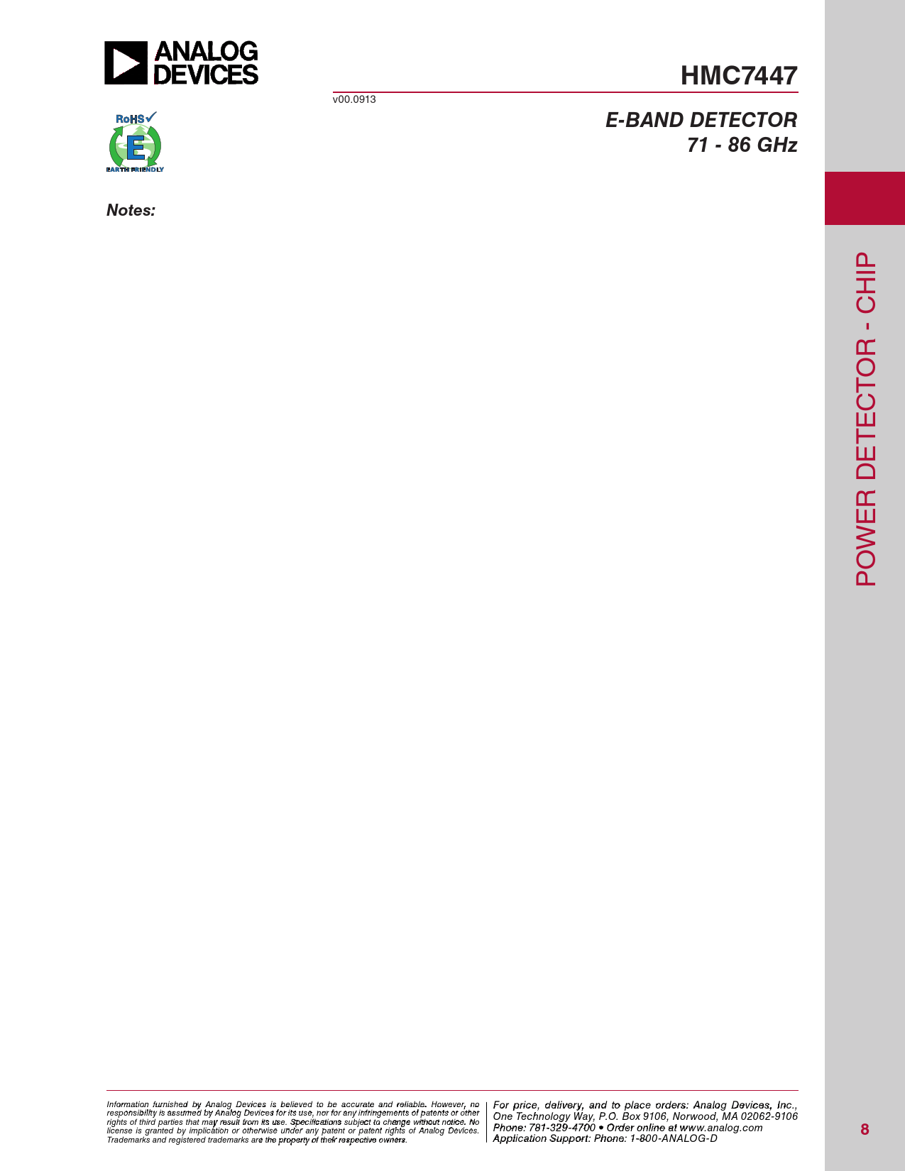 HMC7447 v00.0913 E-BAND DETECTOR71 - 86 GHzNotes: IP H R - C O T C E T E R D E W O P Inf F or o m r p atio r n ifc ur e n , d ishe e d lbiv y e A r n y a alog n D d t evic o p es is la beclie o eved rd to ebre sa: H ccur iattti e tae M nd re ilicarbloew . H a o ve C wever, o n rp o For price, delivery, and to place orders: Analog Devices, Inc., responsibility is assumed by Analog Devices for its use, nor for any infringements of patents or other oration, 2 Elizabeth Drive, Chelmsford, MA 01824 One Technology Way, P.O. Box 9106, Norwood, MA 02062-9106 Phone: 978-250-3343 Fax: 978-250-3373 O rights of third parties that may result from its use. Specifications subject to change without notice. No P rd hone e r O : 7 n 81- -3li 2n 9 e a -47 t w 0 w 0 • O w rd .h e it r o t niltie n .c e ao t m license is granted by implication or otherwise under any patent or patent rights of Analog Devices. www.analog.com 8 Application Support: Pho Trademarks and registered trademarks are the property of their respective owners. ne: 978-250-33 A 4 p 3 p o lica rti a o p n S p u s p @ po h rt itt : P ite ho . n c e om : 1-800-ANALOG-D