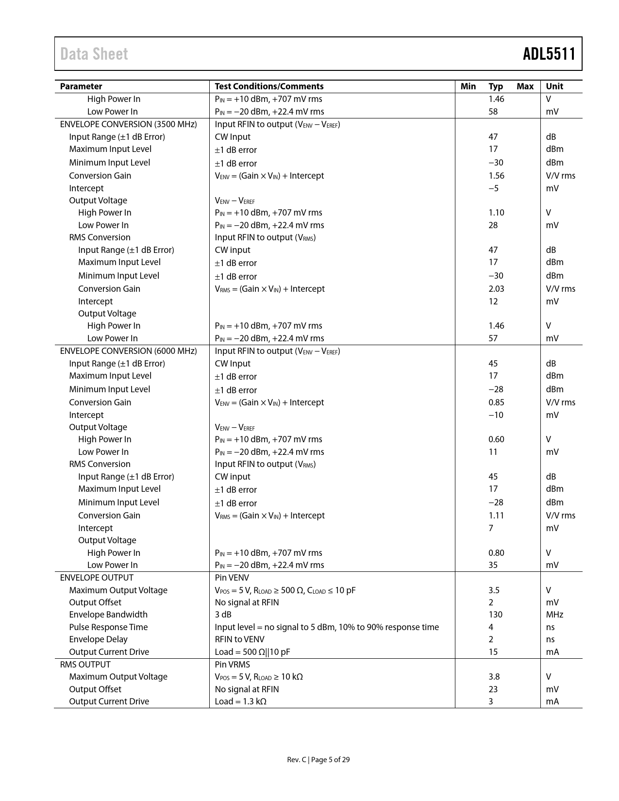Pages / Page30 / 6 — Data Sheet. ADL5511. Parameter. Test Conditions/Comments. Min. Typ. Max …