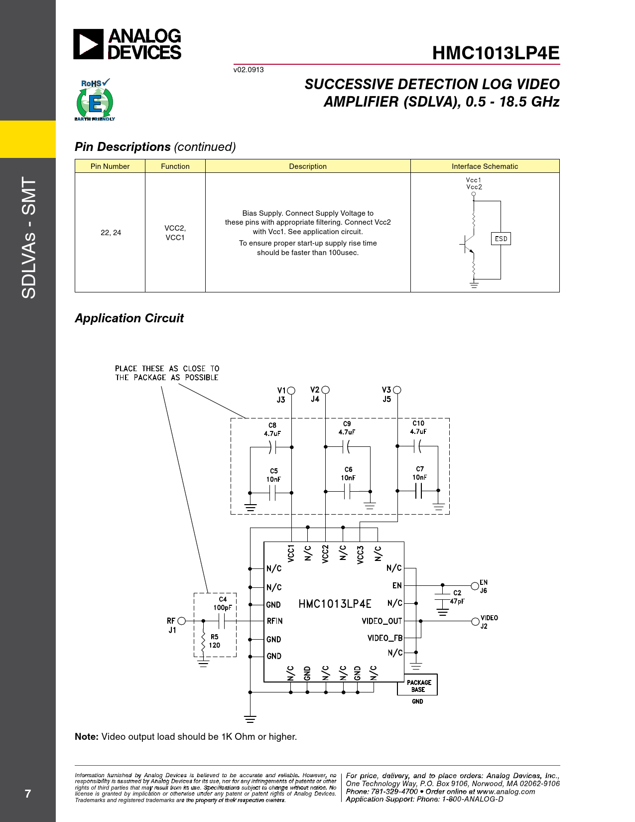 HMC1013LP4E v02.0913 SUCCESSIVE DETECTION LOG VIDEOAMPLIFIER (SDLVA), 0.5 - 18.5 GHzPin Descriptions (continued) Pin Number Function Description Interface Schematic T M S Bias Supply. Connect Supply Voltage to - these pins with appropriate filtering. Connect Vcc2 VCC2, 22, 24 with Vcc1. See application circuit. As VCC1 To ensure proper start-up supply rise time should be faster than 100usec. LV SD Application CircuitNote: Video output load should be 1K Ohm or higher. Inf F or o m r p atio r n ifc ur e n , d ishe e d lbiv y e A r n y a alog n D d t evic o p es is la beclie o eved rd to ebre sa: H ccur iattti e tae M nd re ilicarbloew . H a o ve C wever, o n rp o For price, delivery, and to place orders: Analog Devices, Inc., responsibility is assumed by Analog Devices for its use, nor for any infringements of patents or other oration, 2 Elizabeth Drive, Chelmsford, MA 01824 One Technology Way, P.O. Box 9106, Norwood, MA 02062-9106 Phone: 978-250-3343 Fax: 978-250-3373 O rights of third parties that may result from its use. Specifications subject to change without notice. No P rd hone e r O : 7 n 81- -3li 2n 9 e a -47 t w 0 w 0 • O w rd .h e it r o t niltie n .c e ao t m 7 license is granted by implication or otherwise under any patent or patent rights of Analog Devices. www.analog.com Application Support: Pho Trademarks and registered trademarks are the property of their respective owners. ne: 978-250-33 A 4 p 3 p o lica rti a o p n S p u s p @ po h rt itt : P ite ho . n c e om : 1-800-ANALOG-D