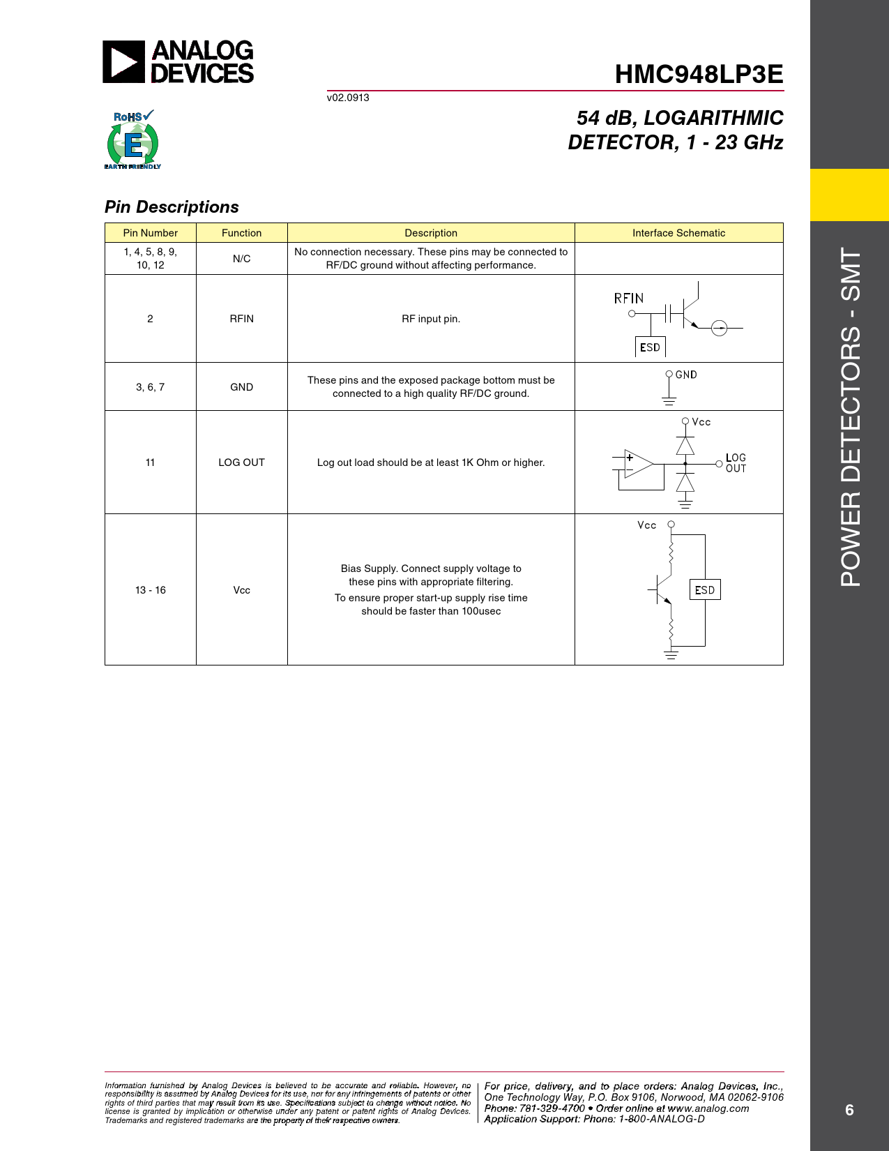 HMC948LP3E. 54 dB, LOGARITHMIC. DETECTOR, 1 - 23 GHz. Pin Descriptions