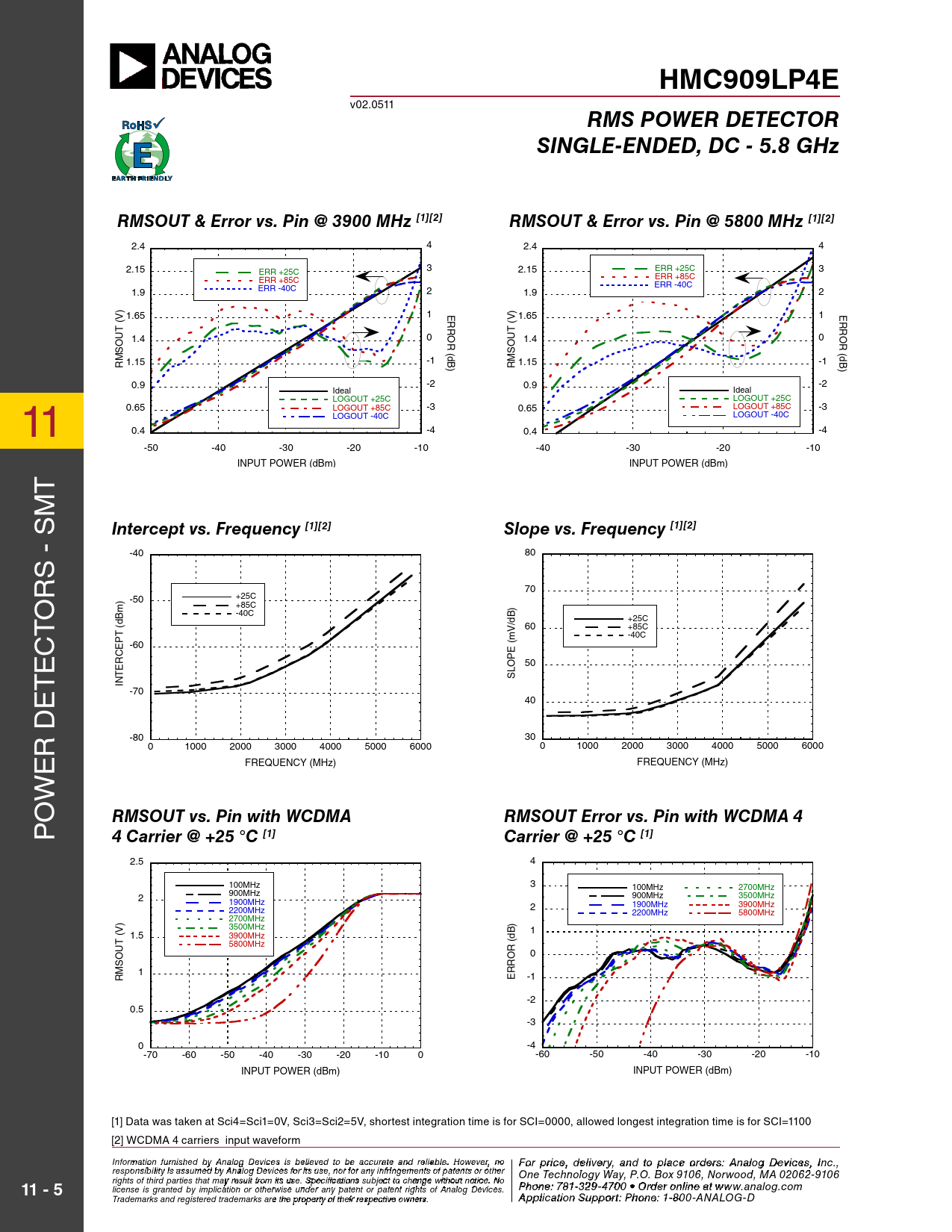RMS POWER DETECTOR SINGLE-ENDED, DC - 5.8 GHz RMSOUT & Error vs. Pin @ 5800 MHz [1][2] RMSOUT & Error vs. Pin @ 3900 MHz [1][2]