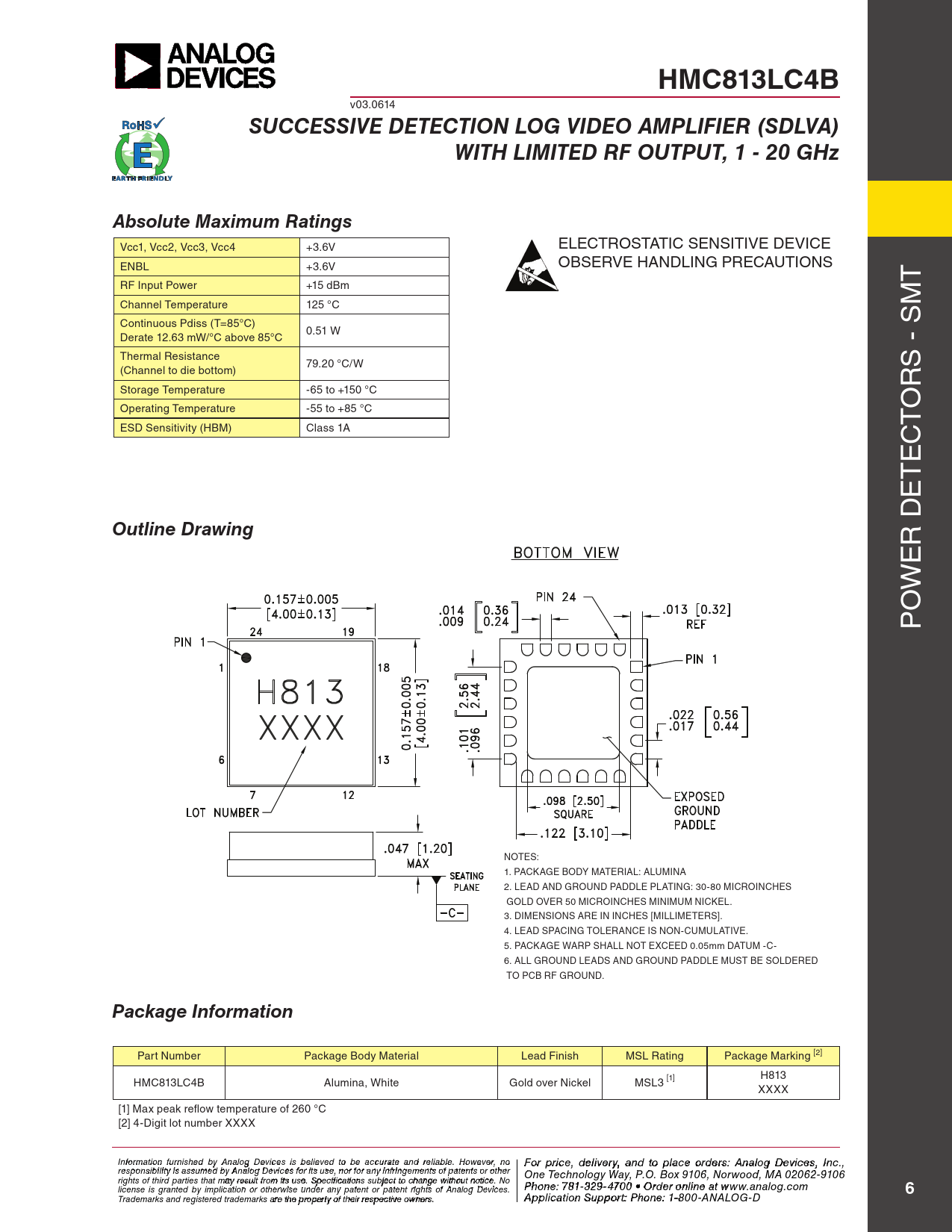 HMC813LC4B. SUCCESSIVE DETECTION LOG VIDEO AMPLIFIER (SDLVA). WITH LIMITED RF OUTPUT, 1 - 20 GHz. Absolute Maximum Ratings