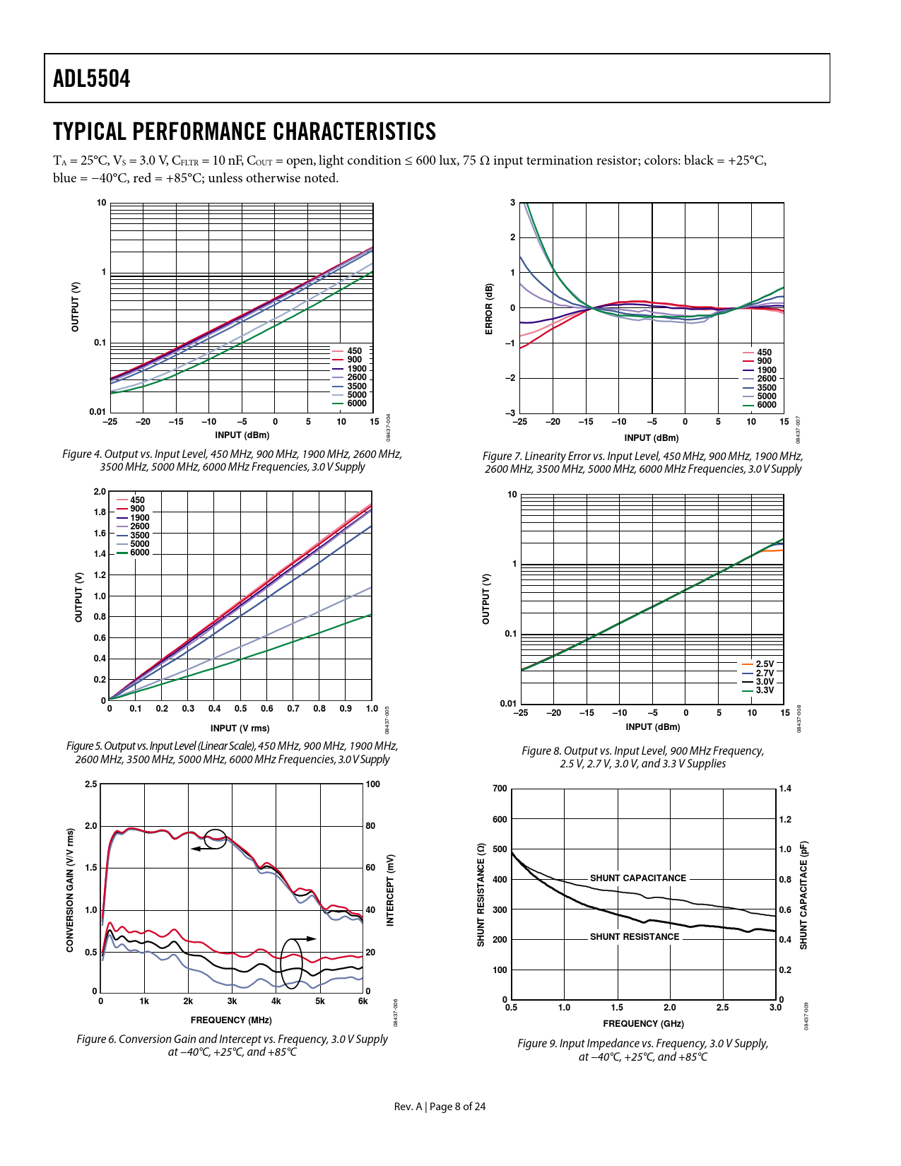 ADL5504. TYPICAL PERFORMANCE CHARACTERISTICS. (V). d R (. T U O. RRO E. 0.1. 450. 900. 1900. 2600. 3500. 5000. 6000. 0.01. –25. –20. –15. –10. INPUT (dBm). 2.0
