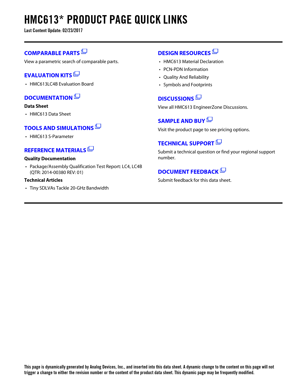 HMC613* PRODUCT PAGE QUICK LINKS Last Content Update: 02/23/2017COMPARABLE PARTSDESIGN RESOURCES View a parametric search of comparable parts. • HMC613 Material Declaration • PCN-PDN Information EVALUATION KITS • Quality And Reliability • HMC613LC4B Evaluation Board • Symbols and Footprints DOCUMENTATIONDISCUSSIONSData Sheet View all HMC613 EngineerZone Discussions. • HMC613 Data Sheet SAMPLE AND BUYTOOLS AND SIMULATIONS Visit the product page to see pricing options. • HMC613 S-Parameter TECHNICAL SUPPORTREFERENCE MATERIALS Submit a technical question or find your regional support Quality Documentation number. • Package/Assembly Qualification Test Report: LC4, LC4B (QTR: 2014-00380 REV: 01) DOCUMENT FEEDBACKTechnical Articles Submit feedback for this data sheet. • Tiny SDLVAs Tackle 20-GHz Bandwidth This page is dynamically generated by Analog Devices, Inc., and inserted into this data sheet. A dynamic change to the content on this page will not trigger a change to either the revision number or the content of the product data sheet. This dynamic page may be frequently modified.