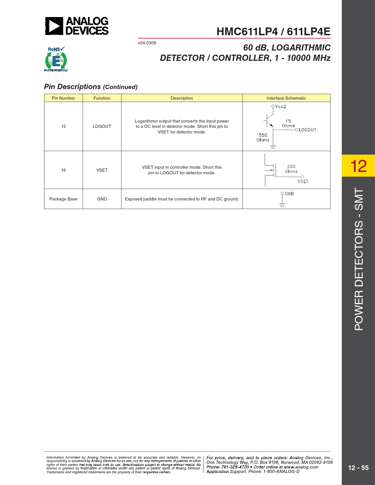 HMC611LP4 / 611LP4E. 60 dB, LOGARITHMIC. DETECTOR / CONTROLLER, 1 - 10000 MHz. Pin Descriptions (Continued). 12 - 55