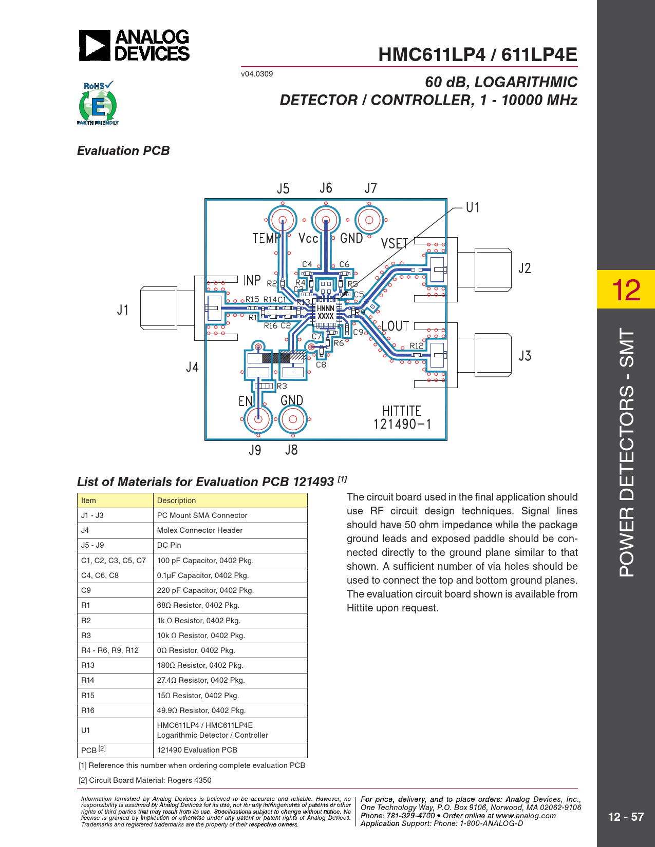 HMC611LP4 / 611LP4E. 60 dB, LOGARITHMIC. DETECTOR / CONTROLLER, 1 - 10000 MHz. Evaluation PCB