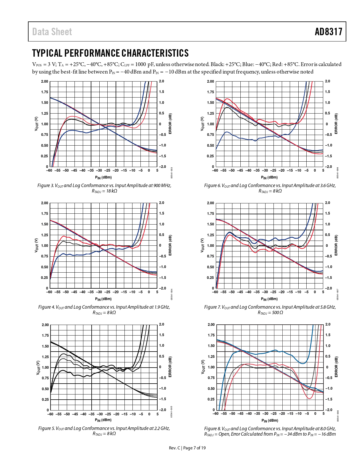 05541- Figure 4. VOUT and Log Conformance vs. Input Amplitude at 1.9 GHz, Figure 7. VOUT and Log Conformance vs. Input Amplitude at 5.8 GHz, RTADJ = 8 kΩ RTADJ = 500 Ω