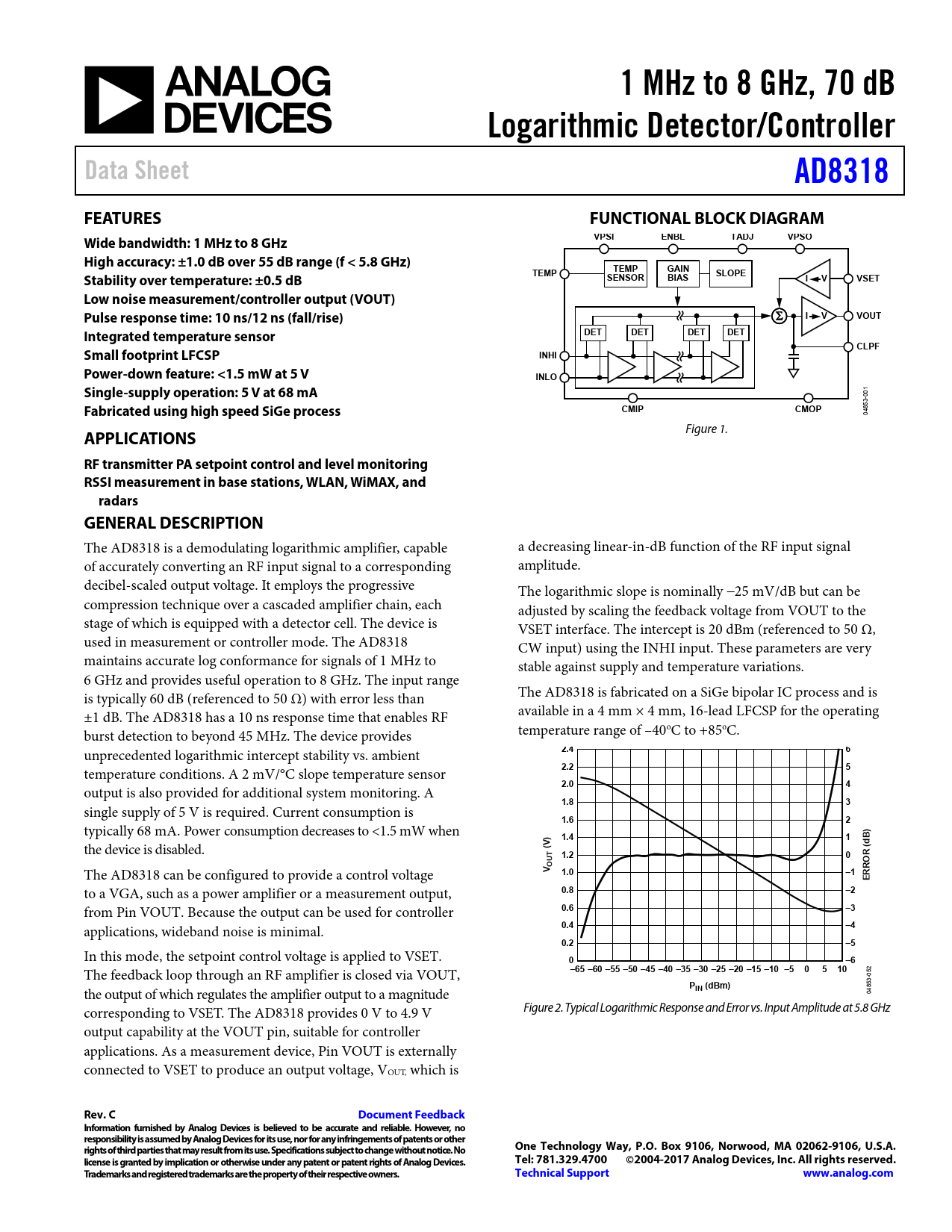 1 MHz to 8 GHz, 70 dB. Logarithmic Detector/Control er. Data Sheet. AD8318. FEATURES. FUNCTIONAL BLOCK DIAGRAM