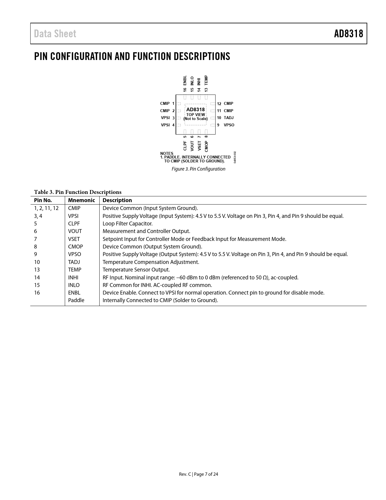 1, 2, 11, 12 CMIP Device Common (Input System Ground). 3, 4 VPSI Positive Supply Voltage (Input System): 4.5 V to 5.5 V. Voltage on Pin 3, Pin 4, and Pin 9 should be equal. 5 CLPF Loop Filter Capacitor. 6 VOUT Measurement and Controller Output. 7 VSET Setpoint Input for Controller Mode or Feedback Input for Measurement Mode. 8 CMOP Device Common (Output System Ground). 9 VPSO Positive Supply Voltage (Output System): 4.5 V to 5.5 V. Voltage on Pin 3, Pin 4, and Pin 9 should be equal. 10 TADJ Temperature Compensation Adjustment. 13 TEMP Temperature Sensor Output. 14 INHI RF Input. Nominal input range: −60 dBm to 0 dBm (referenced to 50 Ω), ac-coupled. 15 INLO RF Common for INHI. AC-coupled RF common. 16 ENBL Device Enable. Connect to VPSI for normal operation. Connect pin to ground for disable mode. Paddle Internally Connected to CMIP (Solder to Ground). Rev. C | Page 7 of 24 Document Outline FEATURES APPLICATIONS FUNCTIONAL BLOCK DIAGRAM GENERAL DESCRIPTION TABLE OF CONTENTS REVISION HISTORY SPECIFICATIONS ABSOLUTE MAXIMUM RATINGS ESD CAUTION PIN CONFIGURATION AND FUNCTION DESCRIPTIONS TYPICAL PERFORMANCE CHARACTERISTICS THEORY OF OPERATION USING THE AD8318 BASIC CONNECTIONS ENABLE INTERFACE INPUT SIGNAL COUPLING OUTPUT INTERFACE SETPOINT INTERFACE TEMPERATURE COMPENSATION OF OUTPUT VOLTAGE TEMPERATURE SENSOR MEASUREMENT MODE DEVICE CALIBRATION AND ERROR CALCULATION SELECTING CALIBRATION POINTS TO IMPROVE ACCURACY OVER A REDUCED RANGE VARIATION IN TEMPERATURE DRIFT FROM DEVICE TO DEVICE TEMPERATURE DRIFT AT DIFFERENT TEMPERATURES SETTING THE OUTPUT SLOPE IN MEASUREMENT MODE RESPONSE TIME CAPABILITY OUTPUT FILTERING CONTROLLER MODE CHARACTERIZATION SETUP AND METHODS EVALUATION BOARD OUTLINE DIMENSIONS ORDERING GUIDE