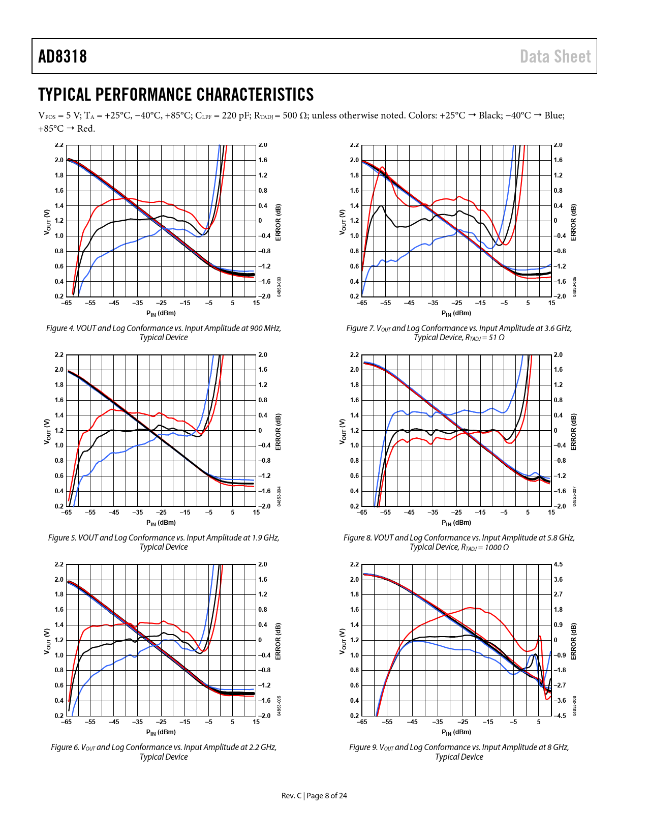 Text Version of Document AD8318 Data Sheet TYPICAL PERFORMANCE CHARACTERISTICS VPOS = 5 V; TA = +25°C, −40°C, +85°C; CLPF = 220 pF; RTADJ = 500 Ω; unless otherwise noted. Colors: +25°C Black; −40°C Blue; +85°C Red.2.2 2.0 2.2 2.0 2.0 1.6 2.0 1.6 1.8 1.2 1.8 1.2 1.6 0.8 1.6 0.8 1.4 0.4 1.4 0.4 dB) dB) (V) 1.2 0 R ( (V) 1.2 0 R ( UT UT V O 1.0 –0.4 V O ERRO 1.0 –0.4 ERRO 0.8 –0.8 0.8 –0.8 0.6 –1.2 0.6 –1.2 0.4 –1.6 0030.4 –1.6 0060.2 04853-–2.0 0.2 04853-–2.0 –65 –55 –45 –35 –25 –15 –5 5 15 –65 –55 –45 –35 –25 –15 –5 5 15 PIN (dBm) PIN (dBm) Figure 4. VOUT and Log Conformance vs. Input Amplitude at 900 MHz, Figure 7. VOUT and Log Conformance vs. Input Amplitude at 3.6 GHz, Typical Device Typical Device, RTADJ = 51 Ω2.2 2.0 2.2 2.0 2.0 1.6 2.0 1.6 1.8 1.2 1.8 1.2 1.6 0.8 1.6 0.8 1.4 0.4 1.4 0.4 dB) dB) (V) 1.2 0 R ( (V) 1.2 0 R ( UT UT V O 1.0 –0.4 V O ERRO 1.0 –0.4 ERRO 0.8 –0.8 0.8 –0.8 0.6 –1.2 0.6 –1.2 0.4 –1.6 0040.4 –1.6 0070.2 04853-–2.0 0.2 04853-–2.0 –65 –55 –45 –35 –25 –15 –5 5 15 –65 –55 –45 –35 –25 –15 –5 5 15 PIN (dBm) PIN (dBm) Figure 5. VOUT and Log Conformance vs. Input Amplitude at 1.9 GHz, Figure 8. VOUT and Log Conformance vs. Input Amplitude at 5.8 GHz, Typical Device Typical Device, RTADJ = 1000 Ω2.2 2.0 2.2 4.5 2.0 1.6 2.0 3.6 1.8 1.2 1.8 2.7 1.6 0.8 1.6 1.8 1.4 0.4 1.4 0.9 dB) dB) (V) 1.2 0 R ( (V) 1.2 0 R ( UT UT V O 1.0 –0.4 V O ERRO 1.0 –0.9 ERRO 0.8 –0.8 0.8 –1.8 0.6 –1.2 0.6 –2.7 0.4 –1.6 0050.4 –3.6 0080.2 04853-–2.0 0.2 04853-–4.5 –65 –55 –45 –35 –25 –15 –5 5 15 –65 –55 –45 –35 –25 –15 –5 5 PIN (dBm) PIN (dBm) Figure 6. VOUT and Log Conformance vs. Input Amplitude at 2.2 GHz, Figure 9. VOUT and Log Conformance vs. Input Amplitude at 8 GHz, Typical Device Typical Device Rev. C | Page 8 of 24 Document Outline FEATURES APPLICATIONS FUNCTIONAL BLOCK DIAGRAM GENERAL DESCRIPTION TABLE OF CONTENTS REVISION HISTORY SPECIFICATIONS ABSOLUTE MAXIMUM RATINGS ESD CAUTION PIN CONFIGURATION AND FUNCTION DESCRIPTIONS TYPICAL PERFORMANCE CHARACTERISTICS THEORY OF OPERATION USING THE AD8318 BASIC CONNECTIONS ENABLE INTERFACE INPUT SIGNAL COUPLING OUTPUT INTERFACE SETPOINT INTERFACE TEMPERATURE COMPENSATION OF OUTPUT VOLTAGE TEMPERATURE SENSOR MEASUREMENT MODE DEVICE CALIBRATION AND ERROR CALCULATION SELECTING CALIBRATION POINTS TO IMPROVE ACCURACY OVER A REDUCED RANGE VARIATION IN TEMPERATURE DRIFT FROM DEVICE TO DEVICE TEMPERATURE DRIFT AT DIFFERENT TEMPERATURES SETTING THE OUTPUT SLOPE IN MEASUREMENT MODE RESPONSE TIME CAPABILITY OUTPUT FILTERING CONTROLLER MODE CHARACTERIZATION SETUP AND METHODS EVALUATION BOARD OUTLINE DIMENSIONS ORDERING GUIDE