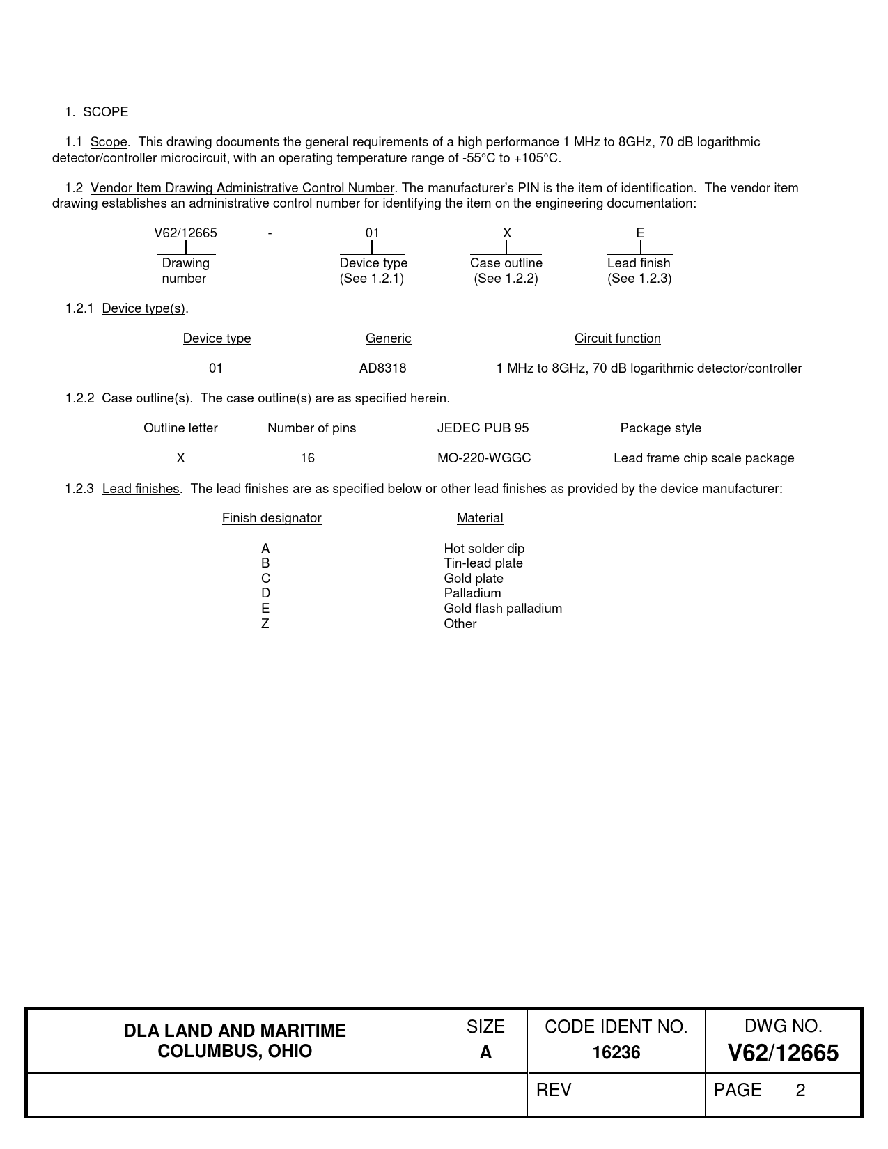 1. SCOPE 1.1 Scope. This drawing documents the general requirements of a high performance 1 MHz to 8GHz, 70 dB logarithmic detector/controller microcircuit, with an operating temperature range of -55°C to +105°C. 1.2 Vendor Item Drawing Administrative Control Number. The manufacturer’s PIN is the item of identification. The vendor item drawing establishes an administrative control number for identifying the item on the engineering documentation: V62/12665 - 01 X E Drawing Device type Case outline Lead finish number (See 1.2.1) (See 1.2.2) (See 1.2.3) 1.2.1 Device type(s). Device type Generic Circuit function 01 AD8318 1 MHz to 8GHz, 70 dB logarithmic detector/controller 1.2.2 Case outline(s). The case outline(s) are as specified herein. Outline letter Number of pins JEDEC PUB 95 Package style X 16 MO-220-WGGC Lead frame chip scale package 1.2.3 Lead finishes. The lead finishes are as specified below or other lead finishes as provided by the device manufacturer: Finish designator Material A Hot solder dip B Tin-lead plate C Gold plate D Palladium E Gold flash palladium Z Other