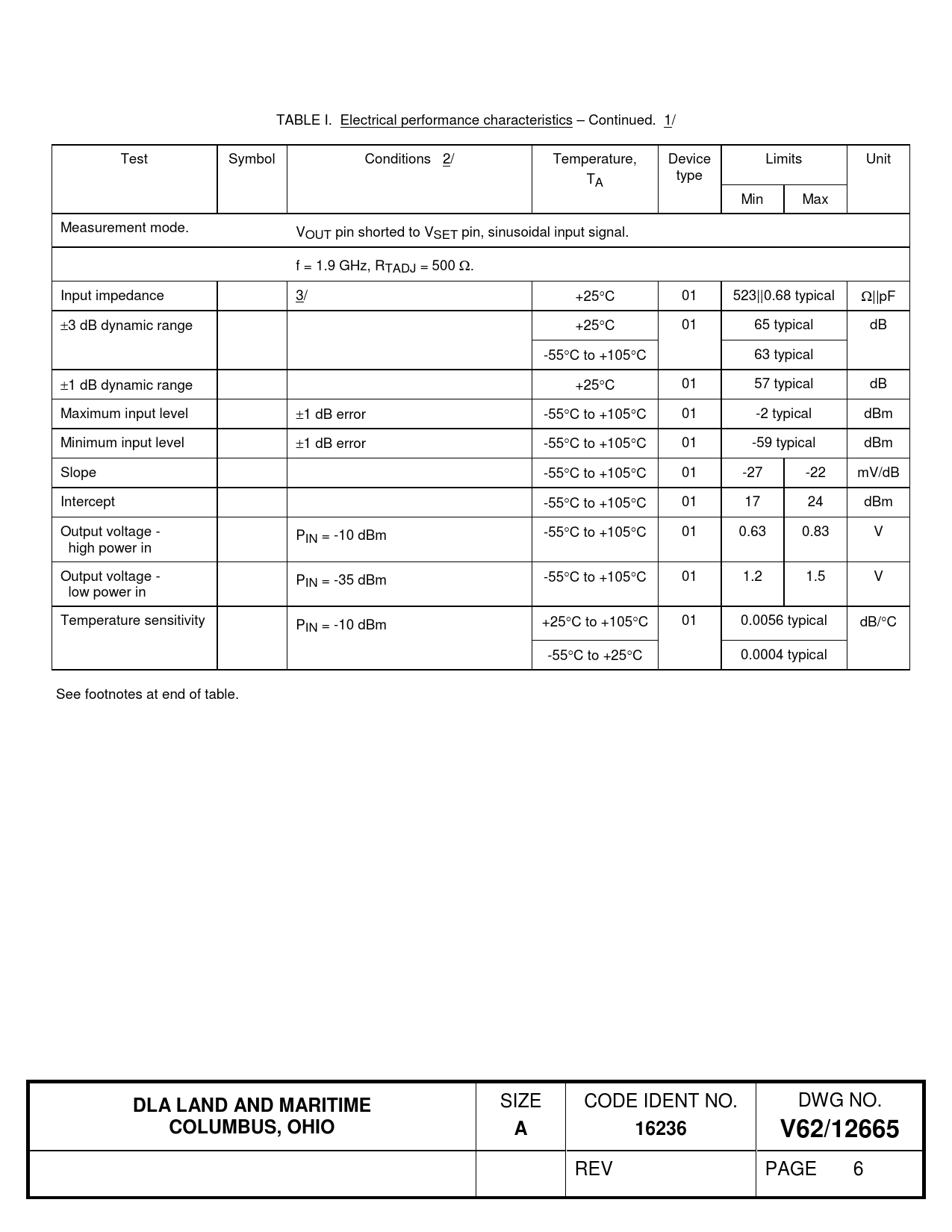 TABLE I. Electrical performance characteristics – Continued. 1/ Test Symbol Conditions 2/ Temperature, Device Limits Unit T type A Min Max Measurement mode. VOUT pin shorted to VSET pin, sinusoidal input signal. f = 1.9 GHz, RTADJ = 500 Ω. Input impedance 3/ +25°C 01 523||0.68 typical Ω||pF ±3 dB dynamic range +25°C 01 65 typical dB -55°C to +105°C 63 typical ±1 dB dynamic range +25°C 01 57 typical dB Maximum input level ±1 dB error -55°C to +105°C 01 -2 typical dBm Minimum input level ±1 dB error -55°C to +105°C 01 -59 typical dBm Slope -55°C to +105°C 01 -27 -22 mV/dB Intercept -55°C to +105°C 01 17 24 dBm Output voltage - PIN = -10 dBm -55°C to +105°C 01 0.63 0.83 V high power in Output voltage - PIN = -35 dBm -55°C to +105°C 01 1.2 1.5 V low power in Temperature sensitivity PIN = -10 dBm +25°C to +105°C 01 0.0056 typical dB/°C -55°C to +25°C 0.0004 typical See footnotes at end of table.