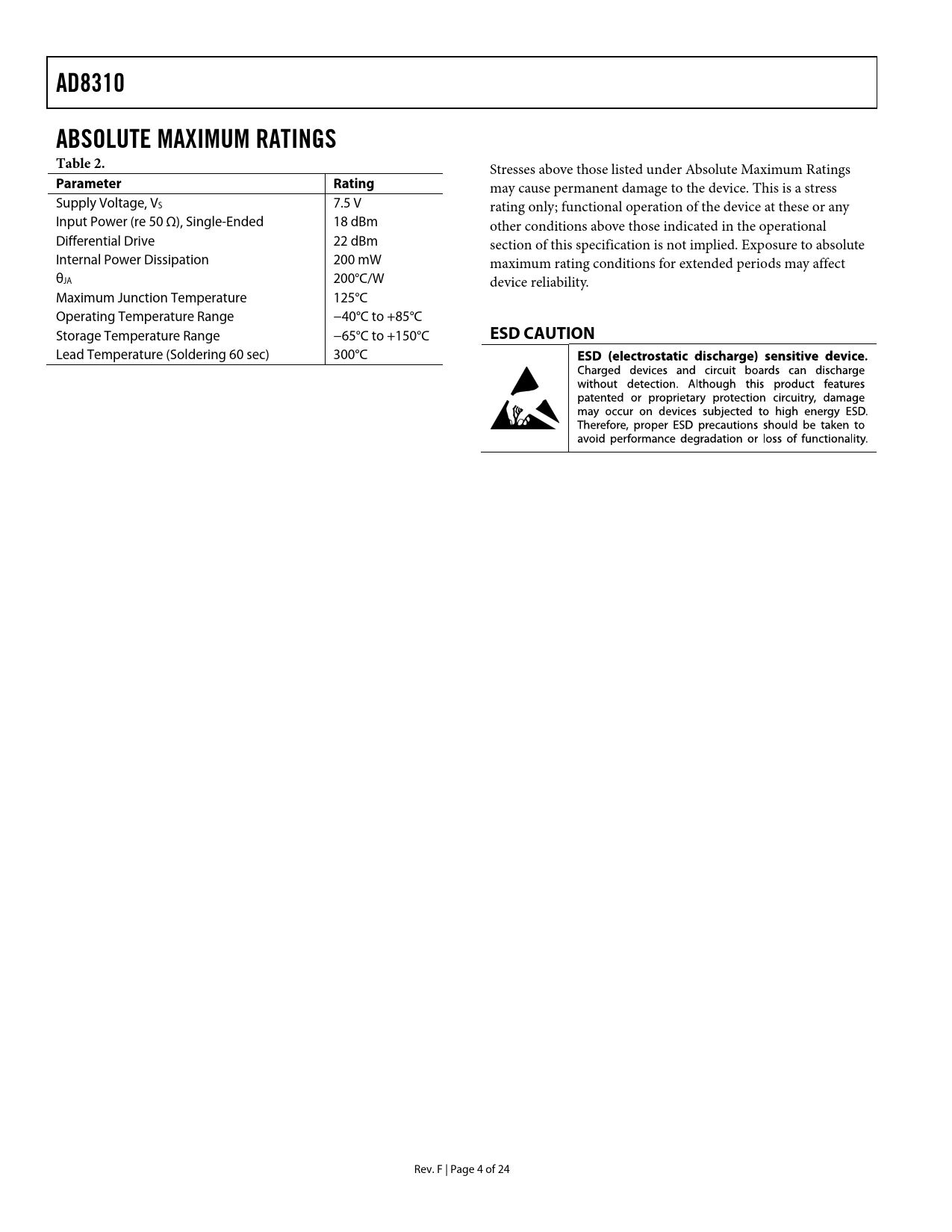 AD8310. ABSOLUTE MAXIMUM RATINGS Table 2. Parameter Rating. ESD CAUTION