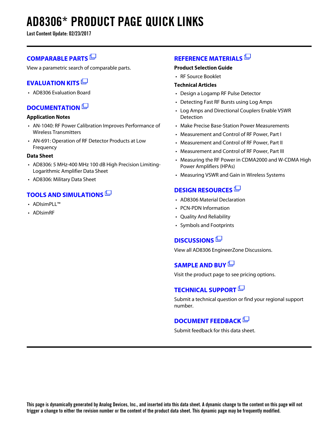AD8306* PRODUCT PAGE QUICK LINKS Last Content Update: 02/23/2017COMPARABLE PARTSREFERENCE MATERIALS View a parametric search of comparable parts. Product Selection Guide • RF Source Booklet EVALUATION KITSTechnical Articles • AD8306 Evaluation Board • Design a Logamp RF Pulse Detector • Detecting Fast RF Bursts using Log Amps DOCUMENTATION • Log Amps and Directional Couplers Enable VSWR Application Notes Detection • AN-1040: RF Power Calibration Improves Performance of • Make Precise Base-Station Power Measurements Wireless Transmitters • Measurement and Control of RF Power, Part I • AN-691: Operation of RF Detector Products at Low • Measurement and Control of RF Power, Part II Frequency • Measurement and Control of RF Power, Part III Data Sheet • Measuring the RF Power in CDMA2000 and W-CDMA High • AD8306: 5 MHz-400 MHz 100 dB High Precision Limiting- Power Amplifiers (HPAs) Logarithmic Amplifier Data Sheet • Measuring VSWR and Gain in Wireless Systems • AD8306: Military Data Sheet DESIGN RESOURCESTOOLS AND SIMULATIONS • AD8306 Material Declaration • ADIsimPLL™ • PCN-PDN Information • ADIsimRF • Quality And Reliability • Symbols and Footprints DISCUSSIONS View all AD8306 EngineerZone Discussions. SAMPLE AND BUY Visit the product page to see pricing options. TECHNICAL SUPPORT Submit a technical question or find your regional support number. DOCUMENT FEEDBACK Submit feedback for this data sheet. This page is dynamically generated by Analog Devices, Inc., and inserted into this data sheet. A dynamic change to the content on this page will not trigger a change to either the revision number or the content of the product data sheet. This dynamic page may be frequently modified.