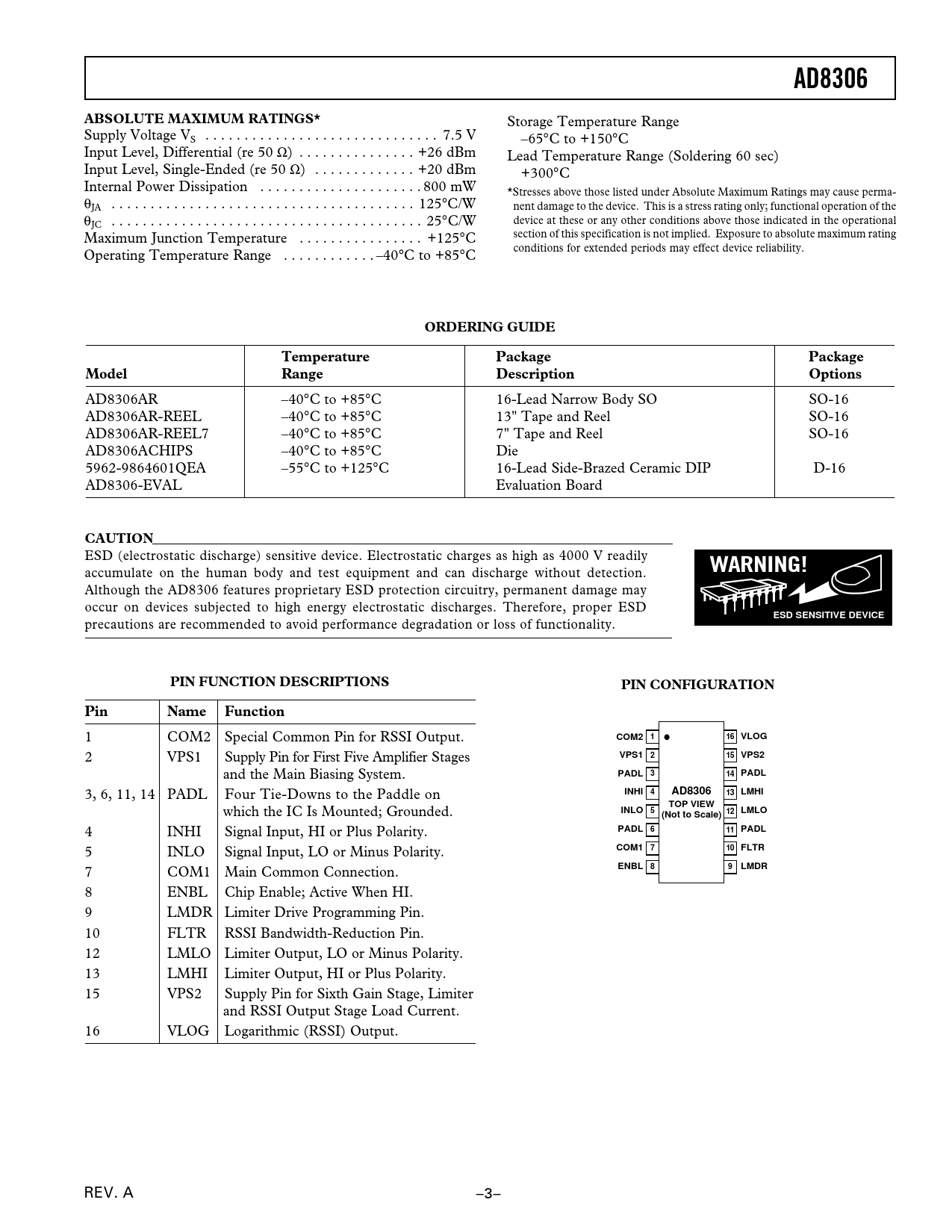 AD8306ABSOLUTE MAXIMUM RATINGS* Storage Temperature Range Supply Voltage VS . 7.5 V –65°C to +150°C Input Level, Differential (re 50 Ω) . +26 dBm Lead Temperature Range (Soldering 60 sec) Input Level, Single-Ended (re 50 Ω) . +20 dBm +300°C Internal Power Dissipation . 800 mW *Stresses above those listed under Absolute Maximum Ratings may cause perma- θJA . 125°C/W nent damage to the device. This is a stress rating only; functional operation of the θ device at these or any other conditions above those indicated in the operational JC . 25°C/W Maximum Junction Temperature . +125°C section of this specification is not implied. Exposure to absolute maximum rating conditions for extended periods may effect device reliability. Operating Temperature Range . –40°C to +85°C ORDERING GUIDETemperaturePackagePackageModelRangeDescriptionOptions AD8306AR –40°C to +85°C 16-Lead Narrow Body SO SO-16 AD8306AR-REEL –40°C to +85°C 13" Tape and Reel SO-16 AD8306AR-REEL7 –40°C to +85°C 7" Tape and Reel SO-16 AD8306ACHIPS –40°C to +85°C Die 5962-9864601QEA –55°C to +125°C 16-Lead Side-Brazed Ceramic DIP D-16 AD8306-EVAL Evaluation Board CAUTION ESD (electrostatic discharge) sensitive device. Electrostatic charges as high as 4000 V readily WARNING! accumulate on the human body and test equipment and can discharge without detection. Although the AD8306 features proprietary ESD protection circuitry, permanent damage may occur on devices subjected to high energy electrostatic discharges. Therefore, proper ESD ESD SENSITIVE DEVICE precautions are recommended to avoid performance degradation or loss of functionality. PIN FUNCTION DESCRIPTIONSPIN CONFIGURATIONPinNameFunction 1 COM2 Special Common Pin for RSSI Output. COM2 116 VLOGVPS1 215 VPS2 2 VPS1 Supply Pin for First Five Amplifier Stages PADL 314 PADL and the Main Biasing System. INHI 4AD830613 LMHI 3, 6, 11, 14 PADL Four Tie-Downs to the Paddle on TOP VIEWINLO 5 which the IC Is Mounted; Grounded. (Not to Scale) 12 LMLOPADL 611 PADL 4 INHI Signal Input, HI or Plus Polarity. COM1 710 FLTR 5 INLO Signal Input, LO or Minus Polarity. ENBL 89LMDR 7 COM1 Main Common Connection. 8 ENBL Chip Enable; Active When HI. 9 LMDR Limiter Drive Programming Pin. 10 FLTR RSSI Bandwidth-Reduction Pin. 12 LMLO Limiter Output, LO or Minus Polarity. 13 LMHI Limiter Output, HI or Plus Polarity. 15 VPS2 Supply Pin for Sixth Gain Stage, Limiter and RSSI Output Stage Load Current. 16 VLOG Logarithmic (RSSI) Output. REV. A –3–
