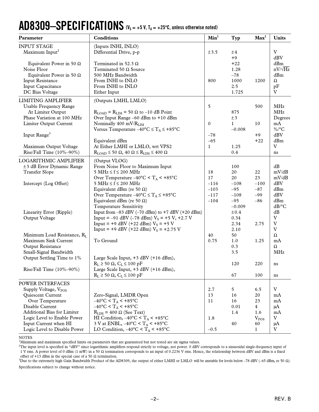 INPUT STAGE (Inputs INHI, INLO) Maximum Input2 Differential Drive, p-p ±3.5 ±4 V +9 dBV Equivalent Power in 50 Ω Terminated in 52.3 Ω +22 dBm Noise Floor Terminated 50 Ω Source 1.28 nV/√Hz Equivalent Power in 50 Ω 500 MHz Bandwidth –78 dBm Input Resistance From INHI to INLO 800 1000 1200 Ω Input Capacitance From INHI to INLO 2.5 pF DC Bias Voltage Either Input 1.725 V LIMITING AMPLIFIER (Outputs LMHI, LMLO) Usable Frequency Range 5 500 MHz At Limiter Output RLOAD = RLIM = 50 Ω to –10 dB Point 875 MHz Phase Variation at 100 MHz Over Input Range –60 dBm to +10 dBm ±3 Degrees Limiter Output Current Nominally 400 mV/RLIM 0 1 10 mA Versus Temperature –40°C ≤ TA ≤ +85°C –0.008 %/°C Input Range3 –78 +9 dBV Equivalent dBm –65 +22 dBm Maximum Output Voltage At Either LMHI or LMLO, wrt VPS2 1 1.25 V Rise/Fall Time (10%–90%) RLOAD ≤ 50 Ω, 40 Ω ≤ RLIM ≤ 400 Ω 0.4 ns LOGARITHMIC AMPLIFIER (Output VLOG) ±3 dB Error Dynamic Range From Noise Floor to Maximum Input 100 dB Transfer Slope 5 MHz ≤ f ≤ 200 MHz 18 20 22 mV/dB Over Temperature –40°C < TA < +85°C 17 20 23 mV/dB Intercept (Log Offset) 5 MHz ≤ f ≤ 200 MHz –116 –108 –100 dBV Equivalent dBm (re 50 Ω) –103 –95 –87 dBm Over Temperature –40°C ≤ TA ≤ +85°C –117 –108 –99 dBV Equivalent dBm (re 50 Ω) –104 –95 –86 dBm Temperature Sensitivity –0.009 dB/°C Linearity Error (Ripple) Input from –83 dBV (–70 dBm) to +7 dBV (+20 dBm) ±0.4 dB Output Voltage Input = –91 dBV (–78 dBm) VS = +5 V, +2.7 V 0.34 V Input = +9 dBV (+22 dBm) VS = +5 V 2.34 2.75 V Input = +9 dBV (+22 dBm) VS = +2.75 V 2.10 V Minimum Load Resistance, RL 40 50 Ω Maximum Sink Current To Ground 0.75 1.0 1.25 mA Output Resistance 0.3 Ω Small-Signal Bandwidth 3.5 MHz Output Settling Time to 1% Large Scale Input, +3 dBV (+16 dBm), R ≤ L ≥␣ 50 Ω, CL ␣ 100 pF 120 220 ns Rise/Fall Time (10%–90%) Large Scale Input, +3 dBV (+16 dBm), R ≤ L ≥␣ 50 Ω, CL ␣ 100 pF 67 100 ns POWER INTERFACES Supply Voltage, VPOS 2.7 5 6.5 V Quiescent Current Zero-Signal, LMDR Open 13 16 20 mA Over Temperature –40°C < TA < +85°C 11 16 23 mA Disable Current –40°C < TA < +85°C 0.01 4 µA Additional Bias for Limiter RLIM = 400 Ω (See Text) 1.4 1.6 mA Logic Level to Enable Power HI Condition, –40°C < TA < +85°C 1.8 VPOS V Input Current when HI 3 V at ENBL, –40°C < TA < +85°C 40 60 µA Logic Level to Disable Power LO Condition, –40°C < TA < +85°C –0.5 1 V NOTES 1Minimum and maximum specified limits on parameters that are guaranteed but not tested are six sigma values. 2The input level is specified in “dBV” since logarithmic amplifiers respond strictly to voltage, not power. 0 dBV corresponds to a sinusoidal single-frequency input of 1 V rms. A power level of 0 dBm (1 mW) in a 50 Ω termination corresponds to an input of 0.2236 V rms. Hence, the relationship between dBV and dBm is a fixed offset of +13 dBm in the special case of a 50 Ω termination. 3Due to the extremely high Gain Bandwidth Product of the AD8309, the output of either LMHI or LMLO will be unstable for levels below –78 dBV (–65 dBm, re 50 Ω). Specifications subject to change without notice. –2– REV. B
