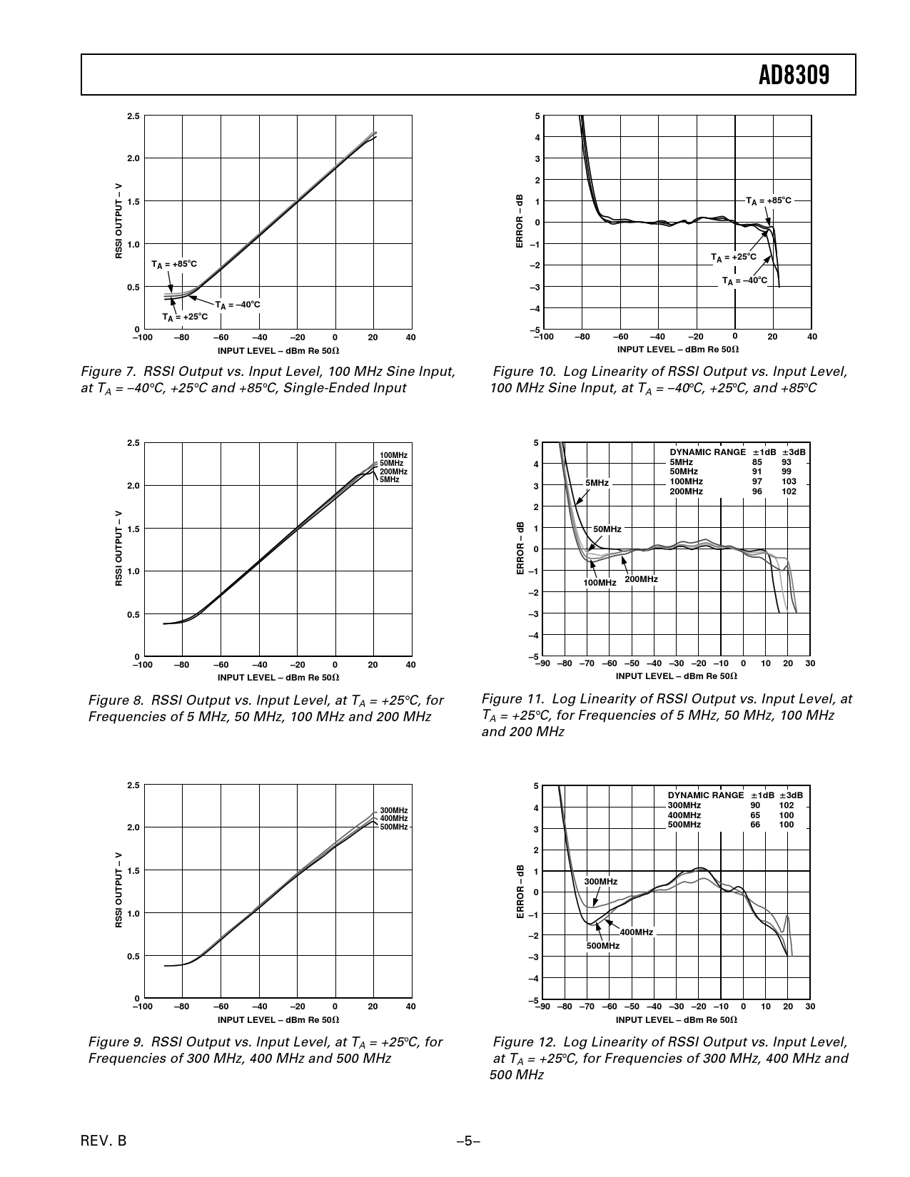 V Figure 9. RSSI Output vs. Input Level, at TA = +25°C, for Figure 12. Log Linearity of RSSI Output vs. Input Level, Frequencies of 300 MHz, 400 MHz and 500 MHz at TA = +25°C, for Frequencies of 300 MHz, 400 MHz and 500 MHz REV. B –5–