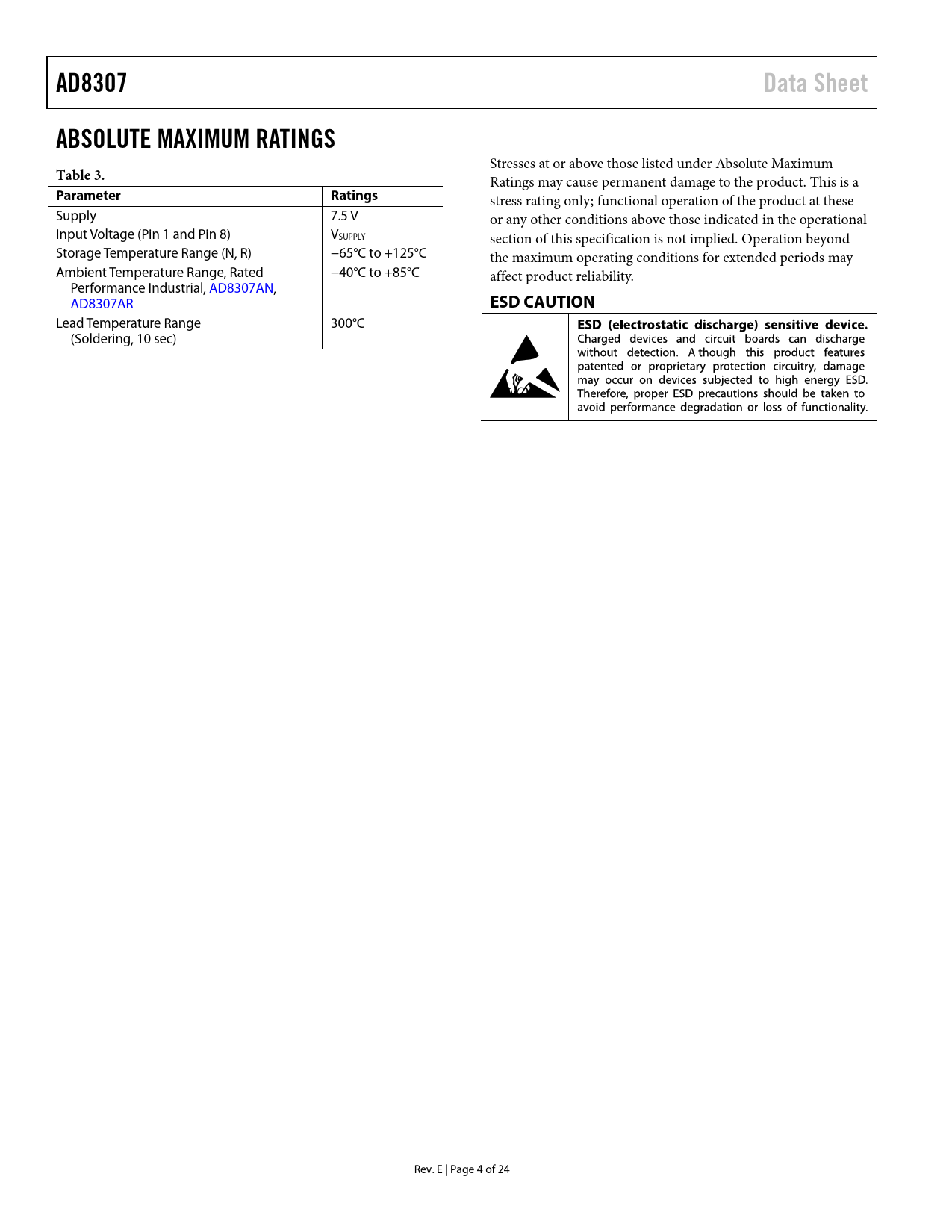 AD8307 Data Sheet ABSOLUTE MAXIMUM RATINGS Table 3 Parameter Ratings ESD CAUTION
