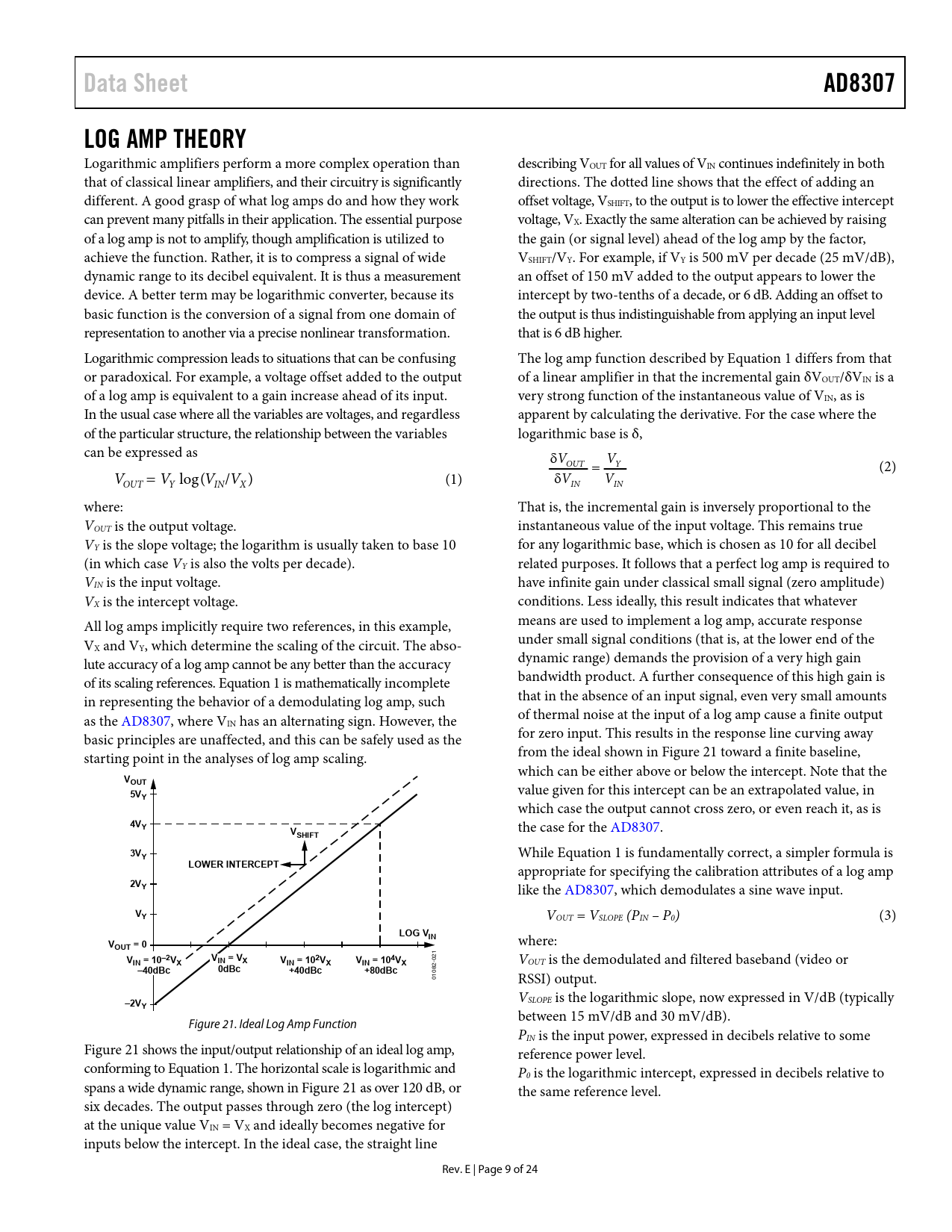 link to page 10 link to page 10 link to page 10 Data SheetAD8307LOG AMP THEORY Logarithmic amplifiers perform a more complex operation than describing VOUT for all values of VIN continues indefinitely in both that of classical linear amplifiers, and their circuitry is significantly directions. The dotted line shows that the effect of adding an different. A good grasp of what log amps do and how they work offset voltage, VSHIFT, to the output is to lower the effective intercept can prevent many pitfalls in their application. The essential purpose voltage, VX. Exactly the same alteration can be achieved by raising of a log amp is not to amplify, though amplification is utilized to the gain (or signal level) ahead of the log amp by the factor, achieve the function. Rather, it is to compress a signal of wide VSHIFT/VY. For example, if VY is 500 mV per decade (25 mV/dB), dynamic range to its decibel equivalent. It is thus a measurement an offset of 150 mV added to the output appears to lower the device. A better term may be logarithmic converter, because its intercept by two-tenths of a decade, or 6 dB. Adding an offset to basic function is the conversion of a signal from one domain of the output is thus indistinguishable from applying an input level representation to another via a precise nonlinear transformation. that is 6 dB higher. Logarithmic compression leads to situations that can be confusing The log amp function described by Equation 1 differs from that or paradoxical. For example, a voltage offset added to the output of a linear amplifier in that the incremental gain δVOUT/δVIN is a of a log amp is equivalent to a gain increase ahead of its input. very strong function of the instantaneous value of VIN, as is In the usual case where all the variables are voltages, and regardless apparent by calculating the derivative. For the case where the of the particular structure, the relationship between the variables logarithmic base is δ, can be expressed as V V OUT Y (2) V V ( log V /V ) (1) V V OUT Y IN X IN IN where: That is, the incremental gain is inversely proportional to the VOUT is the output voltage. instantaneous value of the input voltage. This remains true VY is the slope voltage; the logarithm is usually taken to base 10 for any logarithmic base, which is chosen as 10 for all decibel (in which case VY is also the volts per decade). related purposes. It follows that a perfect log amp is required to VIN is the input voltage. have infinite gain under classical small signal (zero amplitude) VX is the intercept voltage. conditions. Less ideally, this result indicates that whatever All log amps implicitly require two references, in this example, means are used to implement a log amp, accurate response V under small signal conditions (that is, at the lower end of the X and VY, which determine the scaling of the circuit. The abso- lute accuracy of a log amp cannot be any better than the accuracy dynamic range) demands the provision of a very high gain of its scaling references. Equation 1 is mathematically incomplete bandwidth product. A further consequence of this high gain is in representing the behavior of a demodulating log amp, such that in the absence of an input signal, even very small amounts as the AD8307, where V of thermal noise at the input of a log amp cause a finite output IN has an alternating sign. However, the basic principles are unaffected, and this can be safely used as the for zero input. This results in the response line curving away starting point in the analyses of log amp scaling. from the ideal shown in Figure 21 toward a finite baseline, which can be either above or below the intercept. Note that the VOUT5V value given for this intercept can be an extrapolated value, in Y which case the output cannot cross zero, or even reach it, as is 4VYV the case for the AD8307. SHIFT3VY While Equation 1 is fundamentally correct, a simpler formula is LOWER INTERCEPT appropriate for specifying the calibration attributes of a log amp 2VY like the AD8307, which demodulates a sine wave input. VY VOUT = VSLOPE (PIN – P0) (3) LOG VINV where: OUT = 0V 21 VIN = 10–2VXIN = VXVIN = 102VXVIN = 104VX 0 VOUT is the demodulated and filtered baseband (video or –40dBc0dBc 2- +40dBc+80dBc 08 01 RSSI) output. –2V VSLOPE is the logarithmic slope, now expressed in V/dB (typically Y between 15 mV/dB and 30 mV/dB). Figure 21. Ideal Log Amp Function PIN is the input power, expressed in decibels relative to some Figure 21 shows the input/output relationship of an ideal log amp, reference power level. conforming to Equation 1. The horizontal scale is logarithmic and P0 is the logarithmic intercept, expressed in decibels relative to spans a wide dynamic range, shown in Figure 21 as over 120 dB, or the same reference level. six decades. The output passes through zero (the log intercept) at the unique value VIN = VX and ideally becomes negative for inputs below the intercept. In the ideal case, the straight line Rev. E | Page 9 of 24 Document Outline FEATURES APPLICATIONS FUNCTIONAL BLOCK DIAGRAM GENERAL DESCRIPTION TABLE OF CONTENTS REVISION HISTORY SPECIFICATIONS ABSOLUTE MAXIMUM RATINGS ESD CAUTION PIN CONFIGURATION AND FUNCTION DESCRIPTIONS TYPICAL PERFORMANCE CHARACTERISTICS LOG AMP THEORY PROGRESSIVE COMPRESSION DEMODULATING LOG AMPS INTERCEPT CALIBRATION OFFSET CONTROL EXTENSION OF RANGE INTERFACES ENABLE INTERFACE INPUT INTERFACE OFFSET INTERFACE OUTPUT INTERFACE THEORY OF OPERATION BASIC CONNECTIONS INPUT MATCHING NARROW-BAND MATCHING SLOPE AND INTERCEPT ADJUSTMENTS APPLICATIONS INFORMATION BUFFERED OUTPUT FOUR-POLE FILTER 1 µW TO 1 kW 50 Ω POWER METER MEASUREMENT SYSTEM WITH 120 dB DYNAMIC RANGE OPERATION AT LOW FREQUENCIES OUTLINE DIMENSIONS ORDERING GUIDE