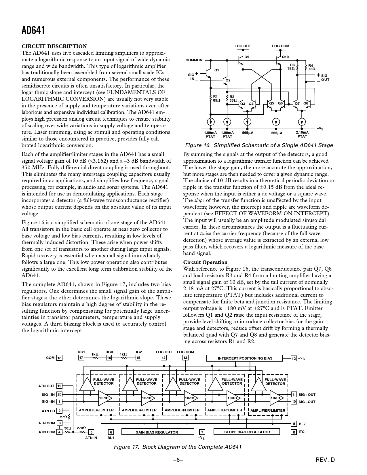 link to page 7 link to page 7 link to page 7 AD641CIRCUIT DESCRIPTIONLOG OUTLOG COM The AD641 uses five cascaded limiting amplifiers to approxi- Q9 mate a logarithmic response to an input signal of wide dynamic Q10COMMON range and wide bandwidth. This type of logarithmic amplifier R3R475 V 75Q1 V has traditionally been assembled from several small scale ICs SIGSIG and numerous external components. The performance of these INQ2OUT semidiscrete circuits is often unsatisfactory. In particular, the logarithmic slope and intercept (see FUNDAMENTALS OF R1 LOGARITHMIC CONVERSION) are usually not very stable R285 V 85 V in the presence of supply and temperature variations even after Q3Q4Q5Q6Q7Q8 laborious and expensive individual calibration. The AD641 em- ploys high precision analog circuit techniques to ensure stability of scaling over wide variations in supply voltage and tempera- –VS ture. Laser trimming, using ac stimuli and operating conditions 1.09mA1.09mA565 m A565 m A2.18mA similar to those encountered in practice, provides fully cali- PTATPTATPTAT brated logarithmic conversion. Figure 16. Simplified Schematic of a Single AD641 Stage Each of the amplifier/limiter stages in the AD641 has a small By summing the signals at the output of the detectors, a good signal voltage gain of 10 dB (×3.162) and a –3 dB bandwidth of approximation to a logarithmic transfer function can be achieved. 350 MHz. Fully differential direct coupling is used throughout. The lower the stage gain, the more accurate the approximation, This eliminates the many interstage coupling capacitors usually but more stages are then needed to cover a given dynamic range. required in ac applications, and simplifies low frequency signal The choice of 10 dB results in a theoretical periodic deviation or processing, for example, in audio and sonar systems. The AD641 ripple in the transfer function of ± 0.15 dB from the ideal re- is intended for use in demodulating applications. Each stage sponse when the input is either a dc voltage or a square wave. incorporates a detector (a full-wave transconductance rectifier) The slope of the transfer function is unaffected by the input whose output current depends on the absolute value of its input waveform; however, the intercept and ripple are waveform de- voltage. pendent (see EFFECT OF WAVEFORM ON INTERCEPT). Figure 16 is a simplified schematic of one stage of the AD641. The input will usually be an amplitude modulated sinusoidal All transistors in the basic cell operate at near zero collector to carrier. In these circumstances the output is a fluctuating cur- base voltage and low bias currents, resulting in low levels of rent at twice the carrier frequency (because of the full wave thermally induced distortion. These arise when power shifts detection) whose average value is extracted by an external low from one set of transistors to another during large input signals. pass filter, which recovers a logarithmic measure of the base- Rapid recovery is essential when a small signal immediately band signal. follows a large one. This low power operation also contributes Circuit Operation significantly to the excellent long term calibration stability of the With reference to Figure 16, the transconductance pair Q7, Q8 AD641. and load resistors R3 and R4 form a limiting amplifier having a The complete AD641, shown in Figure 17, includes two bias small signal gain of 10 dB, set by the tail current of nominally regulators. One determines the small signal gain of the ampli- 2.18 mA at 27°C. This current is basically proportional to abso- fier stages; the other determines the logarithmic slope. These lute temperature (PTAT) but includes additional current to bias regulators maintain a high degree of stability in the re- compensate for finite beta and junction resistance. The limiting sulting function by compensating for potentially large uncer- output voltage is ± 180 mV at +27°C and is PTAT. Emitter tainties in transistor parameters, temperature and supply followers Q1 and Q2 raise the input resistance of the stage, voltages. A third biasing block is used to accurately control provide level shifting to introduce collector bias for the gain the logarithmic intercept. stage and detectors, reduce offset drift by forming a thermally balanced quad with Q7 and Q8 and generate the detector bias- ing across resistors R1 and R2. RG1RG0RG2LOG OUTLOG COM1k V 1k V COM 181716151413INTERCEPT POSITIONING BIAS12 +VSFULL-WAVEFULL-WAVEFULL-WAVEFULL-WAVEFULL-WAVEDETECTORDETECTORDETECTORDETECTORDETECTORATN OUT 19SIG +IN 2011 SIG +OUT10dB10dB10dB10dB10dBSIG –IN110 SIG –OUTATN LO2AMPLIFIER/LIMITERAMPLIFIER/LIMITERAMPLIFIER/LIMITERAMPLIFIER/LIMITERAMPLIFIER/LIMITER27 V ATN COM39BL230 V 270 V ATN COM 456GAIN BIAS REGULATOR7SLOPE BIAS REGULATOR8ITCATN INBL1–VS Figure 17. Block Diagram of the Complete AD641 –6– REV. D Document Outline FEATURES PRODUCT DESCRIPTION PIN CONFIGURATIONS AD641--SPECIFICATIONS ELECTRICAL CHARACTERISTICS THERMAL CHARACTERISTICS ABSOLUTE MAXIMUM RATINGS ESD CAUTION REVISION HISTORY AD641--TYPICAL DC PERFORMANCE CHARACTERISTICS TYPICAL AC PERFORMANCE CHARACTERISTICS CIRCUIT DESCRIPTION CIRCUIT OPERATION FUNDAMENTALS OF LOGARITHMIC CONVERSION INTERCEPT STABILIZATION CONVERSION RANGE EFFECT OF WAVEFORM ON INTERCEPT LOGARITHMIC CONFORMANCE AND WAVEFORM SIGNAL MAGNITUDE INTERCEPT AND LOGARITHMIC OFFSET OPERATION OF A SINGLE AD641 ACTIVE CURENT-TO-VOLTAGE CONVERSION EFFECT OF FREQUENCY ON CALIBRATION SOURCE RESISTANCE AND INPUT OFFSET USING HIGHER SUPPLY VOLTAGES USING THE ATTENUATOR OPERATION OF CASCADED AD641s ELIMINATING THE EFFECT OF FIRST STAGE OFFSET PRACTICAL APPLICATIONS RSSI APPLICATIONS 250 MHz RSSI CONVERTER WITH 58 dB DYNAMIC RANGE OUTLINE DIMENSIONS ORDERING GUIDE