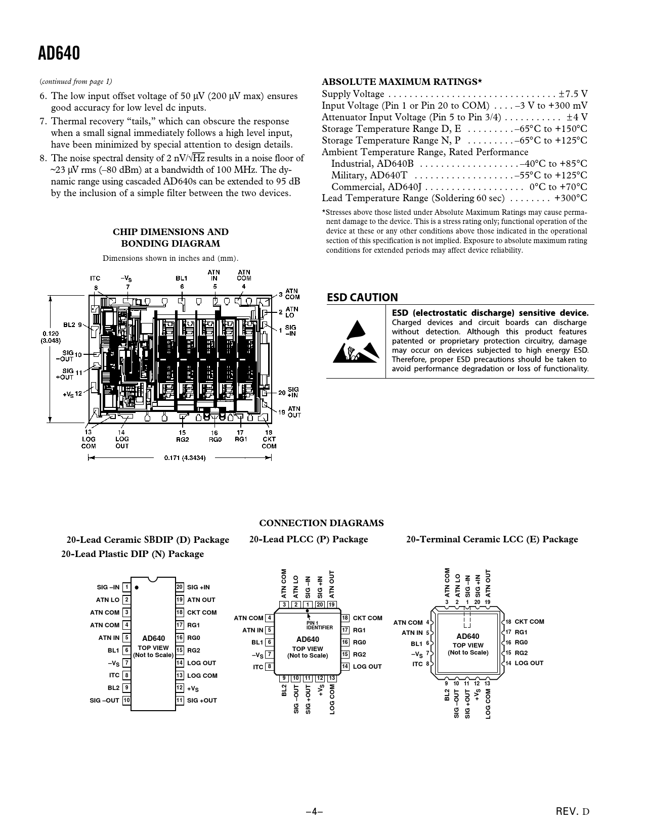 AD640. ABSOLUTE MAXIMUM RATINGS*. CHIP DIMENSIONS AND. BONDING DIAGRAM. ESD CAUTION. CONNECTION DIAGRAMS