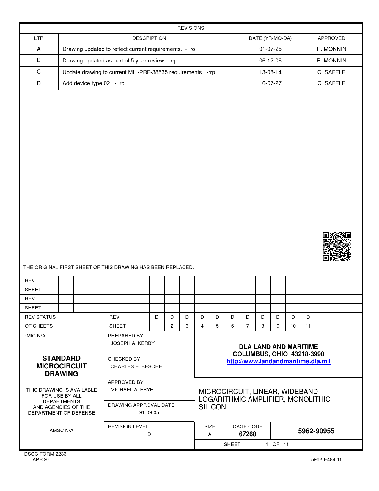 REVISIONS LTR DESCRIPTION DATE (YR-MO-DA) APPROVED A Drawing updated to reflect current requirements. - ro 01-07-25 R. MONNIN B Drawing updated as part of 5 year review. -rrp 06-12-06 R. MONNIN C Update drawing to current MIL-PRF-38535 requirements. -rrp 13-08-14 C. SAFFLE D Add device type 02. - ro 16-07-27 C. SAFFLE THE ORIGINAL FIRST SHEET OF THIS DRAWING HAS BEEN REPLACED. REV SHEET REV SHEET REV STATUS REV D D D D D D D D D D D OF SHEETS SHEET 1 2 3 4 5 6 7 8 9 10 11 PMIC N/A PREPARED BY JOSEPH A. KERBY DLA LAND AND MARITIMECOLUMBUS, OHIO 43218-3990STANDARD CHECKED BY http://www.landandmaritime.dla.milMICROCIRCUIT CHARLES E. BESORE DRAWING APPROVED BY THIS DRAWING IS AVAILABLE MICHAEL A. FRYE MICROCIRCUIT, LINEAR, WIDEBAND FOR USE BY ALL DEPARTMENTS LOGARITHMIC AMPLIFIER, MONOLITHIC AND AGENCIES OF THE DRAWING APPROVAL DATE SILICON DEPARTMENT OF DEFENSE 91-09-05 REVISION LEVEL SIZE CAGE CODE AMSC N/A 5962-90955 D A 67268 SHEET 1 OF 11 DSCC FORM 2233 APR 97 5962-E484-16