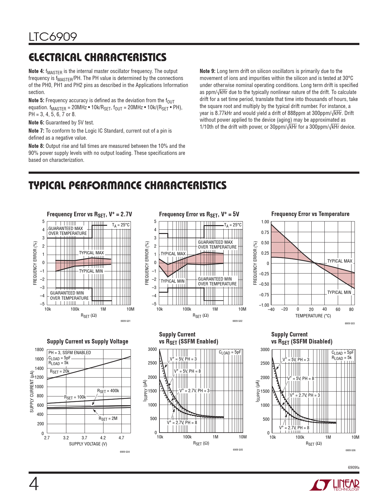 LTC6909 electricAl chArActeristics Note 4: fMASTER is the internal master oscillator frequency. The output Note 9: Long term drift on silicon oscillators is primarily due to the frequency is fMASTER/PH. The PH value is determined by the connections movement of ions and impurities within the silicon and is tested at 30°C of the PH0, PH1 and PH2 pins as described in the Applications Information under otherwise nominal operating conditions. Long term drift is specified section. as ppm/√kHr due to the typically nonlinear nature of the drift. To calculate Note 5: Frequency accuracy is defined as the deviation from the f drift for a set time period, translate that time into thousands of hours, take OUT equation. f the square root and multiply by the typical drift number. For instance, a MASTER = 20MHz • 10k/RSET, fOUT = 20MHz • 10k/(RSET • PH), PH = 3, 4, 5, 6, 7 or 8. year is 8.77kHr and would yield a drift of 888ppm at 300ppm/√kHr. Drift Note 6: Guaranteed by 5V test. without power applied to the device (aging) may be approximated as 1/10th of the drift with power, or 30ppm/√kHr for a 300ppm/√kHr device. Note 7: To conform to the Logic IC Standard, current out of a pin is defined as a negative value. Note 8: Output rise and fall times are measured between the 10% and the 90% power supply levels with no output loading. These specifications are based on characterization. typicAl perForMAnce chArActeristicsFrequency Error vs RSET, V+ = 2.7VFrequency Error vs RSET, V+ = 5VFrequency Error vs Temperature 5 5 1.00 TA = 25°C TA = 25°C 4 GUARANTEED MAX 4 OVER TEMPERATURE 0.75 3 3 GUARANTEED MAX 0.50 2 2 OVER TEMPERATURE 1 TYPICAL MAX 1 TYPICAL MAX 0.25 0 0 0 TYPICAL MAX –1 TYPICAL MIN –1 –0.25 –2 –2 GUARANTEED MIN FREQUENCY ERROR (%) FREQUENCY ERROR (%) TYPICAL MIN OVER TEMPERATURE FREQUENCY ERROR (%) –0.50 –3 –3 TYPICAL MIN –4 GUARANTEED MIN –0.75 OVER TEMPERATURE –4 –5 –5 –1.00 10k 100k 1M 10M 10k 100k 1M 10M –40 –20 0 20 40 60 80 RSET (Ω) RSET (Ω) TEMPERATURE (°C) 6909 G01 6909 G02 6909 G03 Supply CurrentSupply CurrentSupply Current vs Supply Voltagevs RSET (SSFM Enabled)vs RSET (SSFM Disabled) 1800 3000 3000 PH = 3, SSFM ENABLED CLOAD = 5pF CLOAD = 5pF 1600 CLOAD = 5pF V+ = 5V, PH = 3 RLOAD = 5k V+ = 5V, PH = 3 RLOAD = 5k 2500 2500 1400 RSET = 20k V+ = 5V, PH = 8 1200 2000 2000 V+ = 5V, PH = 8 1000 (µA) (µA) R Y SET = 400k 1500 V+ = 2.7V, PH = 3 Y 1500 800 V+ = 2.7V, PH = 3 Y CURRENT (µA) RSET = 100k I SUPPL I SUPPL 600 1000 1000 SUPPL 400 RSET = 2M 500 500 200 V+ = 2.7V, PH = 8 V+ = 2.7V, PH = 8 0 0 0 2.7 3.2 3.7 4.2 4.7 10k 100k 1M 10M 10k 100k 1M 10M SUPPLY VOLTAGE (V) RSET (Ω) RSET (Ω) 6909 G05 6909 G04 6909 G06 6909fa 4 Document Outline Features Applications Description Typical Application Absolute Maximum Ratings Pin Configuration Order Information Electrical Characteristics Typical Performance Characteristics Pin Functions Block Diagram Operation Applications Information Typical Applications Package Description Revision History Typical Application Related Parts