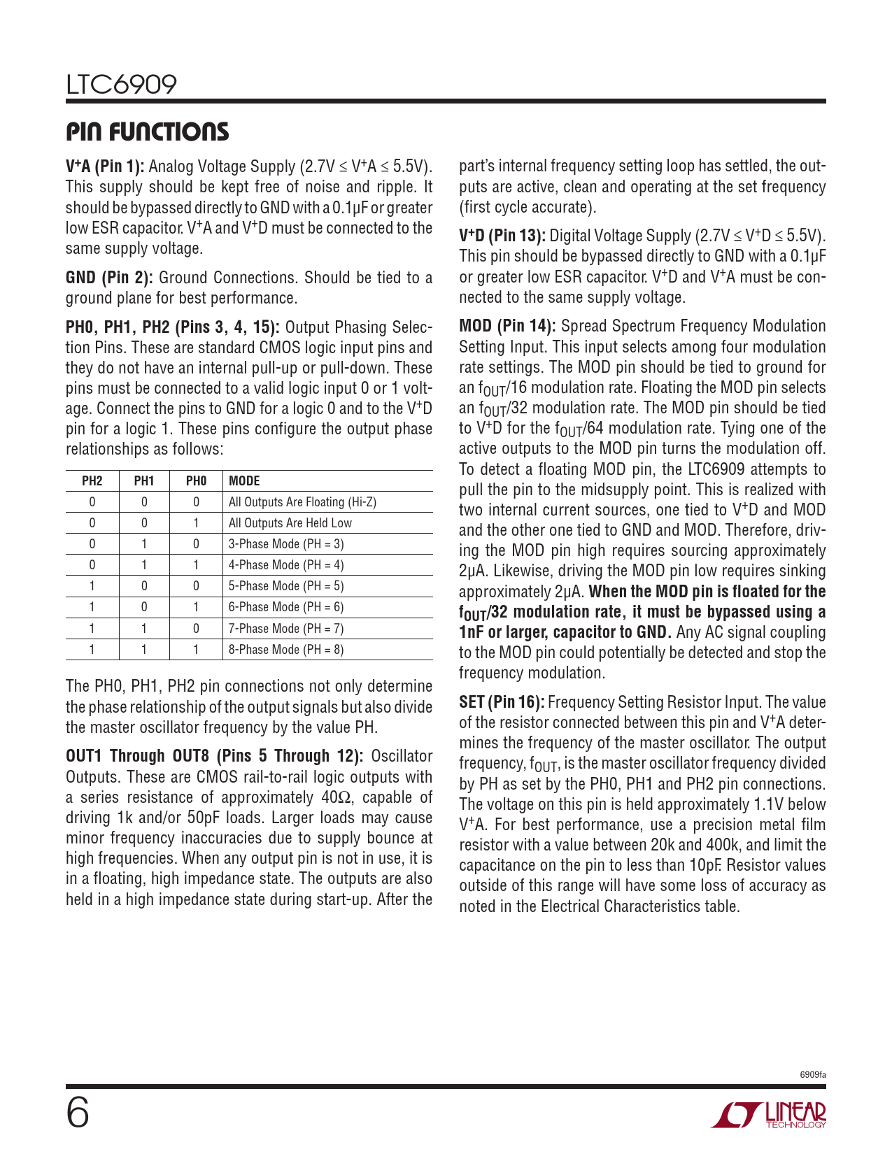 LTC6909 pin Functions V+A (Pin 1): Analog Voltage Supply (2.7V ≤ V+A ≤ 5.5V). part’s internal frequency setting loop has settled, the out- This supply should be kept free of noise and ripple. It puts are active, clean and operating at the set frequency should be bypassed directly to GND with a 0.1µF or greater (first cycle accurate). low ESR capacitor. V+A and V+D must be connected to the V+D (Pin 13): Digital Voltage Supply (2.7V ≤ V+D ≤ 5.5V). same supply voltage. This pin should be bypassed directly to GND with a 0.1µF GND (Pin 2): Ground Connections. Should be tied to a or greater low ESR capacitor. V+D and V+A must be con- ground plane for best performance. nected to the same supply voltage. PH0, PH1, PH2 (Pins 3, 4, 15): Output Phasing Selec- MOD (Pin 14): Spread Spectrum Frequency Modulation tion Pins. These are standard CMOS logic input pins and Setting Input. This input selects among four modulation they do not have an internal pull-up or pull-down. These rate settings. The MOD pin should be tied to ground for pins must be connected to a valid logic input 0 or 1 volt- an fOUT/16 modulation rate. Floating the MOD pin selects age. Connect the pins to GND for a logic 0 and to the V+D an fOUT/32 modulation rate. The MOD pin should be tied pin for a logic 1. These pins configure the output phase to V+D for the fOUT/64 modulation rate. Tying one of the relationships as follows: active outputs to the MOD pin turns the modulation off. To detect a floating MOD pin, the LTC6909 attempts to PH2PH1PH0MODE pull the pin to the midsupply point. This is realized with 0 0 0 All Outputs Are Floating (Hi-Z) two internal current sources, one tied to V+D and MOD 0 0 1 All Outputs Are Held Low and the other one tied to GND and MOD. Therefore, driv- 0 1 0 3-Phase Mode (PH = 3) ing the MOD pin high requires sourcing approximately 0 1 1 4-Phase Mode (PH = 4) 2µA. Likewise, driving the MOD pin low requires sinking 1 0 0 5-Phase Mode (PH = 5) approximately 2µA. When the MOD pin is floated for the 1 0 1 6-Phase Mode (PH = 6) fOUT/32 modulation rate, it must be bypassed using a 1 1 0 7-Phase Mode (PH = 7) 1nF or larger, capacitor to GND. Any AC signal coupling 1 1 1 8-Phase Mode (PH = 8) to the MOD pin could potentially be detected and stop the frequency modulation. The PH0, PH1, PH2 pin connections not only determine the phase relationship of the output signals but also divide SET (Pin 16): Frequency Setting Resistor Input. The value the master oscillator frequency by the value PH. of the resistor connected between this pin and V+A deter- mines the frequency of the master oscillator. The output OUT1 Through OUT8 (Pins 5 Through 12): Oscillator frequency, f Outputs. These are CMOS rail-to-rail logic outputs with OUT, is the master oscillator frequency divided by PH as set by the PH0, PH1 and PH2 pin connections. a series resistance of approximately 40Ω, capable of The voltage on this pin is held approximately 1.1V below driving 1k and/or 50pF loads. Larger loads may cause V+A. For best performance, use a precision metal film minor frequency inaccuracies due to supply bounce at resistor with a value between 20k and 400k, and limit the high frequencies. When any output pin is not in use, it is capacitance on the pin to less than 10pF. Resistor values in a floating, high impedance state. The outputs are also outside of this range will have some loss of accuracy as held in a high impedance state during start-up. After the noted in the Electrical Characteristics table. 6909fa 6 Document Outline Features Applications Description Typical Application Absolute Maximum Ratings Pin Configuration Order Information Electrical Characteristics Typical Performance Characteristics Pin Functions Block Diagram Operation Applications Information Typical Applications Package Description Revision History Typical Application Related Parts