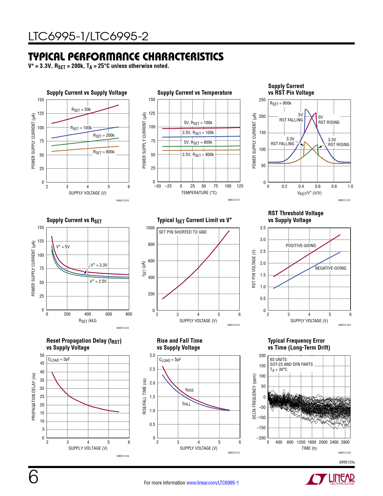 150 150 250 RSET = 800k RSET = 50k 125 125 200 5V RST FALLING 5V 5V, RSET = 100k RST RISING 100 RSET = 100k 100 2.5V, R R SET = 100k 150 SET = 200k Y CURRENT (µA) 75 75 3.3V 5V, R Y CURRENT (µA) 3.3V SET = 800k RST FALLING RST RISING R 100 50 SET = 800k 50 2.5V, RSET = 800k POWER SUPPL 50 25 POWER SUPPLY CURRENT (µA) 25 POWER SUPPL 0 0 0 2 3 4 5 6 –50 –25 0 25 50 75 100 125 0 0.2 0.4 0.6 0.8 1.0 SUPPLY VOLTAGE (V) TEMPERATURE (°C) VRST/V+ (V/V) 699512 G10 699512 G11 699512 G12