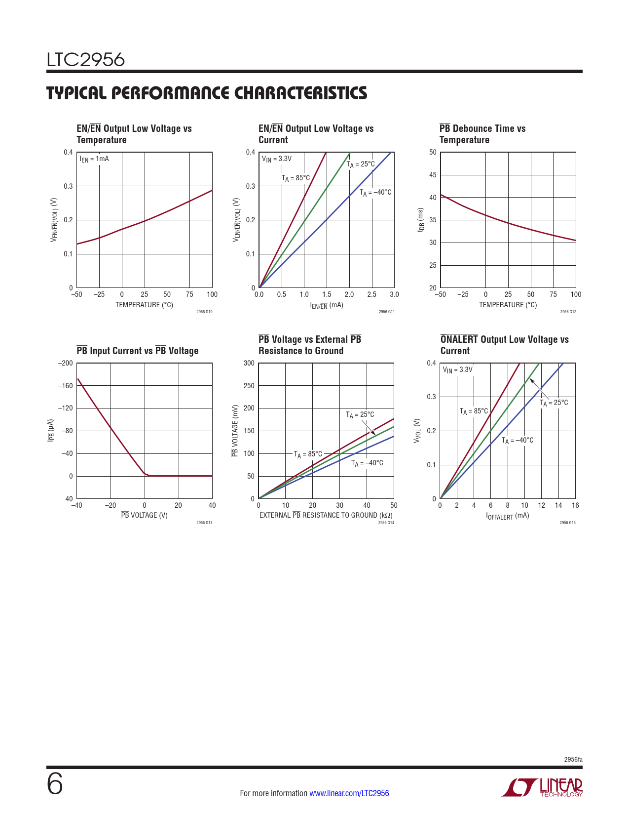 –200 300 0.4 VIN = 3.3V –160 250 0.3 T –120 200 A = 25°C T T A = 25°C A = 85°C (V) (µA) –80 TAGE (mV) 150 0.2 I PB V VOL T VOL A = –40°C –40 PB 100 TA = 85°C TA = –40°C 0.1 0 50 40 0 0 –40 –20 0 20 40 0 10 20 30 40 50 0 2 4 6 8 10 12 14 16 PB VOLTAGE (V) EXTERNAL PB RESISTANCE TO GROUND (kΩ) IOFFALERT (mA) 2956 G13 2956 G14 2956 G15 2956fa 6 For more information www.linear.com/LTC2956