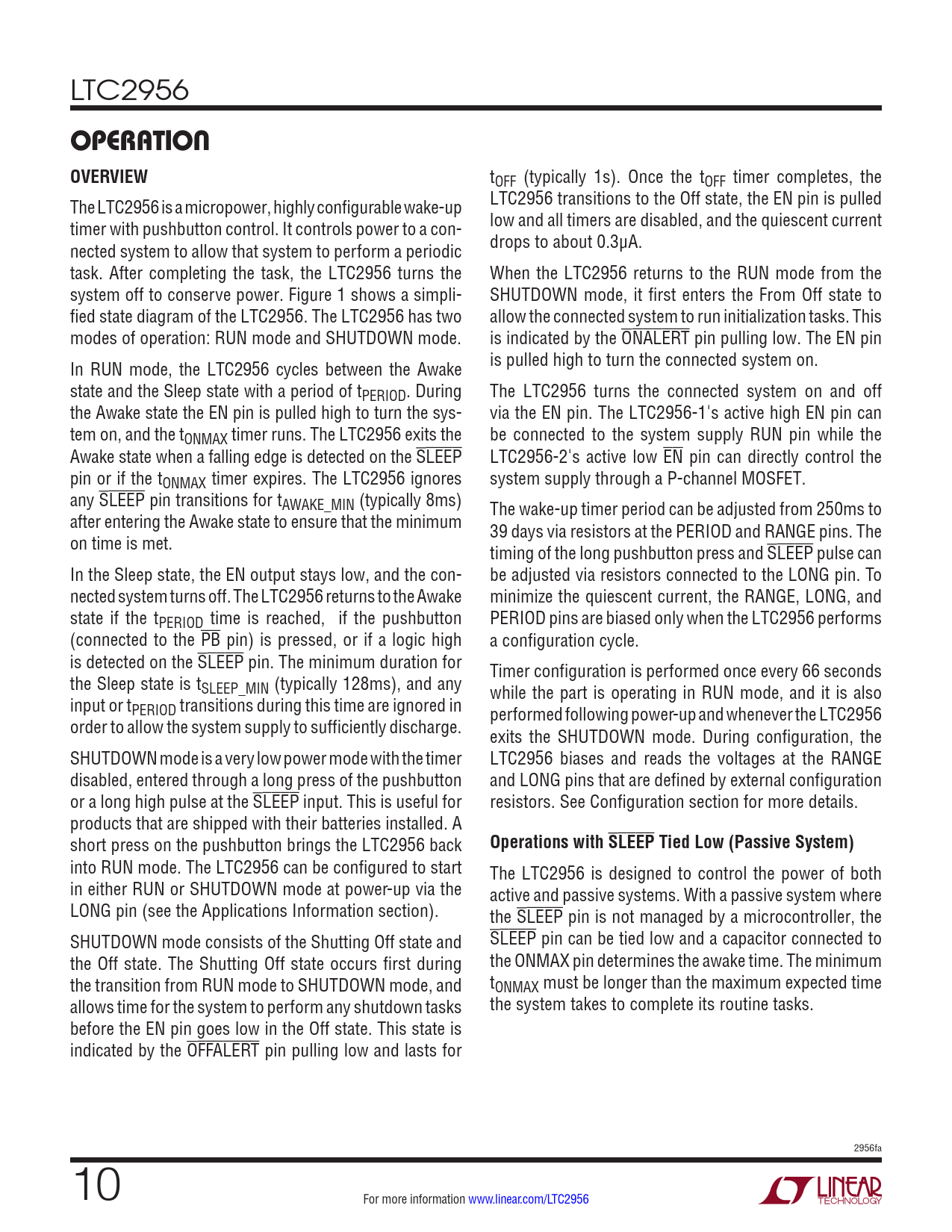 tOFF (typically 1s). Once the tOFF timer completes, the The LTC2956 is a micropower, highly configurable wake-up LTC2956 transitions to the Off state, the EN pin is pulled timer with pushbutton control. It controls power to a con- low and all timers are disabled, and the quiescent current nected system to allow that system to perform a periodic drops to about 0.3μA. task. After completing the task, the LTC2956 turns the When the LTC2956 returns to the RUN mode from the system off to conserve power. Figure 1 shows a simpli- SHUTDOWN mode, it first enters the From Off state to fied state diagram of the LTC2956. The LTC2956 has two allow the connected system to run initialization tasks. This modes of operation: RUN mode and SHUTDOWN mode. is indicated by the ONALERT pin pulling low. The EN pin In RUN mode, the LTC2956 cycles between the Awake is pulled high to turn the connected system on. state and the Sleep state with a period of tPERIOD. During The LTC2956 turns the connected system on and off the Awake state the EN pin is pulled high to turn the sys- via the EN pin. The LTC2956-1's active high EN pin can tem on, and the tONMAX timer runs. The LTC2956 exits the be connected to the system supply RUN pin while the Awake state when a falling edge is detected on the SLEEP LTC2956-2's active low EN pin can directly control the pin or if the tONMAX timer expires. The LTC2956 ignores system supply through a P-channel MOSFET. any SLEEP pin transitions for tAWAKE_MIN (typically 8ms) The wake-up timer period can be adjusted from 250ms to after entering the Awake state to ensure that the minimum 39 days via resistors at the PERIOD and RANGE pins. The on time is met. timing of the long pushbutton press and SLEEP pulse can In the Sleep state, the EN output stays low, and the con- be adjusted via resistors connected to the LONG pin. To nected system turns off. The LTC2956 returns to the Awake minimize the quiescent current, the RANGE, LONG, and state if the tPERIOD time is reached, if the pushbutton PERIOD pins are biased only when the LTC2956 performs (connected to the PB pin) is pressed, or if a logic high a configuration cycle. is detected on the SLEEP pin. The minimum duration for Timer configuration is performed once every 66 seconds the Sleep state is tSLEEP_MIN (typically 128ms), and any while the part is operating in RUN mode, and it is also input or tPERIOD transitions during this time are ignored in performed following power-up and whenever the LTC2956 order to allow the system supply to sufficiently discharge. exits the SHUTDOWN mode. During configuration, the SHUTDOWN mode is a very low power mode with the timer LTC2956 biases and reads the voltages at the RANGE disabled, entered through a long press of the pushbutton and LONG pins that are defined by external configuration or a long high pulse at the SLEEP input. This is useful for resistors. See Configuration section for more details. products that are shipped with their batteries installed. A short press on the pushbutton brings the LTC2956 back