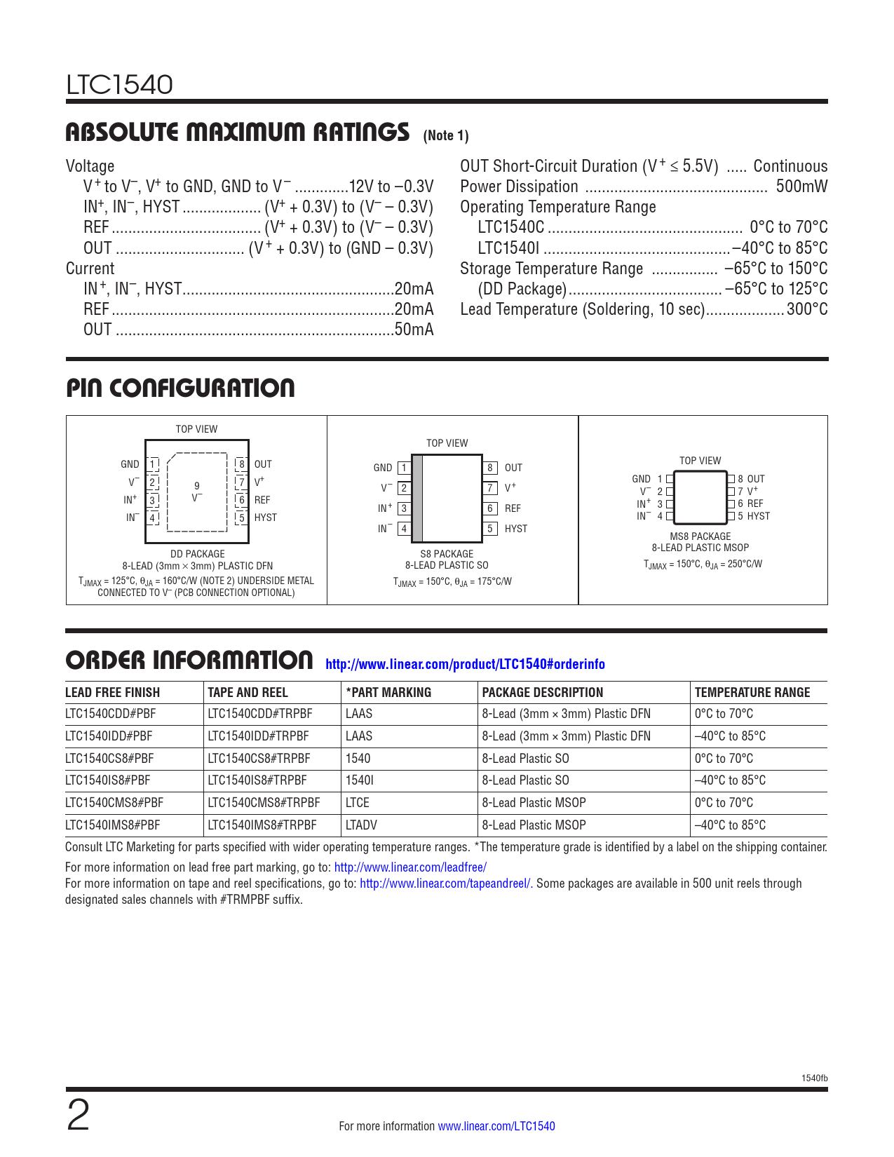 LTC1540 ABSOLUTE MAXIMUM RATINGS (Note 1) Voltage OUT Short-Circuit Duration (V+ ≤ 5.5V) ... Continuous V+ to V–, V+ to GND, GND to V– ...12V to –0.3V Power Dissipation .. 500mW IN+, IN–, HYST ... (V+ + 0.3V) to (V– – 0.3V) Operating Temperature Range REF .. (V+ + 0.3V) to (V– – 0.3V) LTC1540C ... 0°C to 70°C OUT ... (V+ + 0.3V) to (GND – 0.3V) LTC1540I ...–40°C to 85°C Current Storage Temperature Range .. –65°C to 150°C IN+, IN–, HYST ...20mA (DD Package) ... –65°C to 125°C REF ..20mA Lead Temperature (Soldering, 10 sec) ...300°C OUT ...50mA PIN CONFIGURATION TOP VIEW TOP VIEW GND 1 8 OUT TOP VIEW GND 1 8 OUT V– 2 7 GND 1 8 OUT 9 V+ V– 2 7 V+ V– 2 7 V+ IN+ 3 V– 6 REF IN+ 3 6 REF IN+ 3 6 REF IN– 4 5 HYST IN– 4 5 HYST IN– 4 5 HYST MS8 PACKAGE 8-LEAD PLASTIC MSOP DD PACKAGE S8 PACKAGE 8-LEAD (3mm × 3mm) PLASTIC DFN 8-LEAD PLASTIC SO TJMAX = 150°C, θJA = 250°C/W TJMAX = 125°C, θJA = 160°C/W (NOTE 2) UNDERSIDE METAL TJMAX = 150°C, θJA = 175°C/W CONNECTED TO V– (PCB CONNECTION OPTIONAL) ORDER INFORMATION http://www.linear.com/product/LTC1540#orderinfoLEAD FREE FINISHTAPE AND REEL*PART MARKINGPACKAGE DESCRIPTIONTEMPERATURE RANGE LTC1540CDD#PBF LTC1540CDD#TRPBF LAAS 8-Lead (3mm × 3mm) Plastic DFN 0°C to 70°C LTC1540IDD#PBF LTC1540IDD#TRPBF LAAS 8-Lead (3mm × 3mm) Plastic DFN –40°C to 85°C LTC1540CS8#PBF LTC1540CS8#TRPBF 1540 8-Lead Plastic SO 0°C to 70°C LTC1540IS8#PBF LTC1540IS8#TRPBF 1540I 8-Lead Plastic SO –40°C to 85°C LTC1540CMS8#PBF LTC1540CMS8#TRPBF LTCE 8-Lead Plastic MSOP 0°C to 70°C LTC1540IMS8#PBF LTC1540IMS8#TRPBF LTADV 8-Lead Plastic MSOP –40°C to 85°C Consult LTC Marketing for parts specified with wider operating temperature ranges. *The temperature grade is identified by a label on the shipping container. For more information on lead free part marking, go to: http://www.linear.com/leadfree/ For more information on tape and reel specifications, go to: http://www.linear.com/tapeandreel/. Some packages are available in 500 unit reels through designated sales channels with #TRMPBF suffix. 1540fb 2 For more information www.linear.com/LTC1540