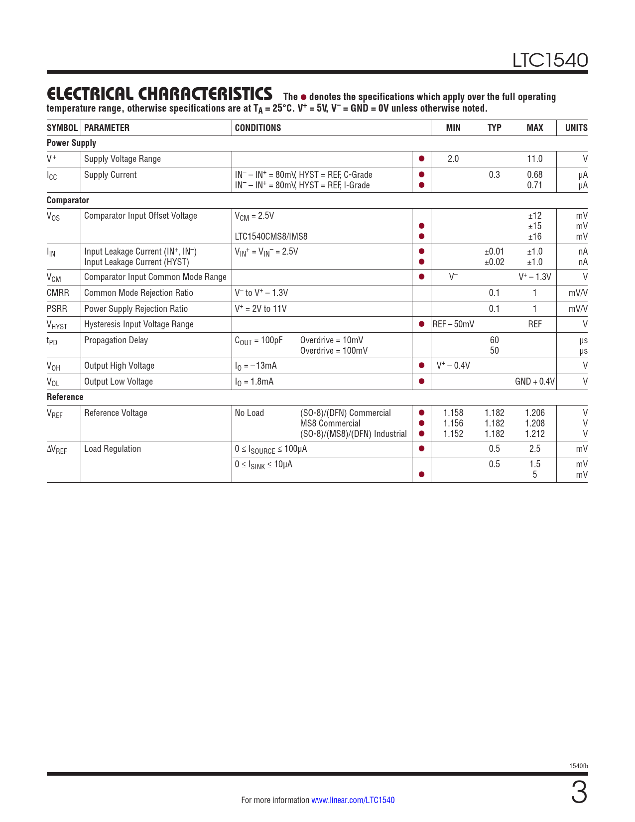 LTC1540 ELECTRICAL CHARACTERISTICSThe l denotes the specifications which apply over the full operatingtemperature range, otherwise specifications are at TA = 25°C. V+ = 5V, V– = GND = 0V unless otherwise noted. SYMBOL PARAMETERCONDITIONSMINTYPMAXUNITSPower Supply V+ Supply Voltage Range l 2.0 11.0 V ICC Supply Current IN– – IN+ = 80mV, HYST = REF, C-Grade l 0.3 0.68 µA IN– – IN+ = 80mV, HYST = REF, I-Grade l 0.71 µA Comparator VOS Comparator Input Offset Voltage VCM = 2.5V ±12 mV l ±15 mV LTC1540CMS8/IMS8 l ±16 mV I + – IN Input Leakage Current (IN+, IN–) VIN = VIN = 2.5V l ±0.01 ±1.0 nA Input Leakage Current (HYST) l ±0.02 ±1.0 nA VCM Comparator Input Common Mode Range l V– V+ – 1.3V V CMRR Common Mode Rejection Ratio V– to V+ – 1.3V 0.1 1 mV/V PSRR Power Supply Rejection Ratio V+ = 2V to 11V 0.1 1 mV/V VHYST Hysteresis Input Voltage Range l REF – 50mV REF V tPD Propagation Delay COUT = 100pF Overdrive = 10mV 60 µs Overdrive = 100mV 50 µs VOH Output High Voltage IO = –13mA l V+ – 0.4V V VOL Output Low Voltage IO = 1.8mA l GND + 0.4V V Reference VREF Reference Voltage No Load (SO-8)/(DFN) Commercial l 1.158 1.182 1.206 V MS8 Commercial l 1.156 1.182 1.208 V (SO-8)/(MS8)/(DFN) Industrial l 1.152 1.182 1.212 V ∆VREF Load Regulation 0 ≤ ISOURCE ≤ 100µA l 0.5 2.5 mV 0 ≤ ISINK ≤ 10µA 0.5 1.5 mV l 5 mV 1540fb For more information www.linear.com/LTC1540 3