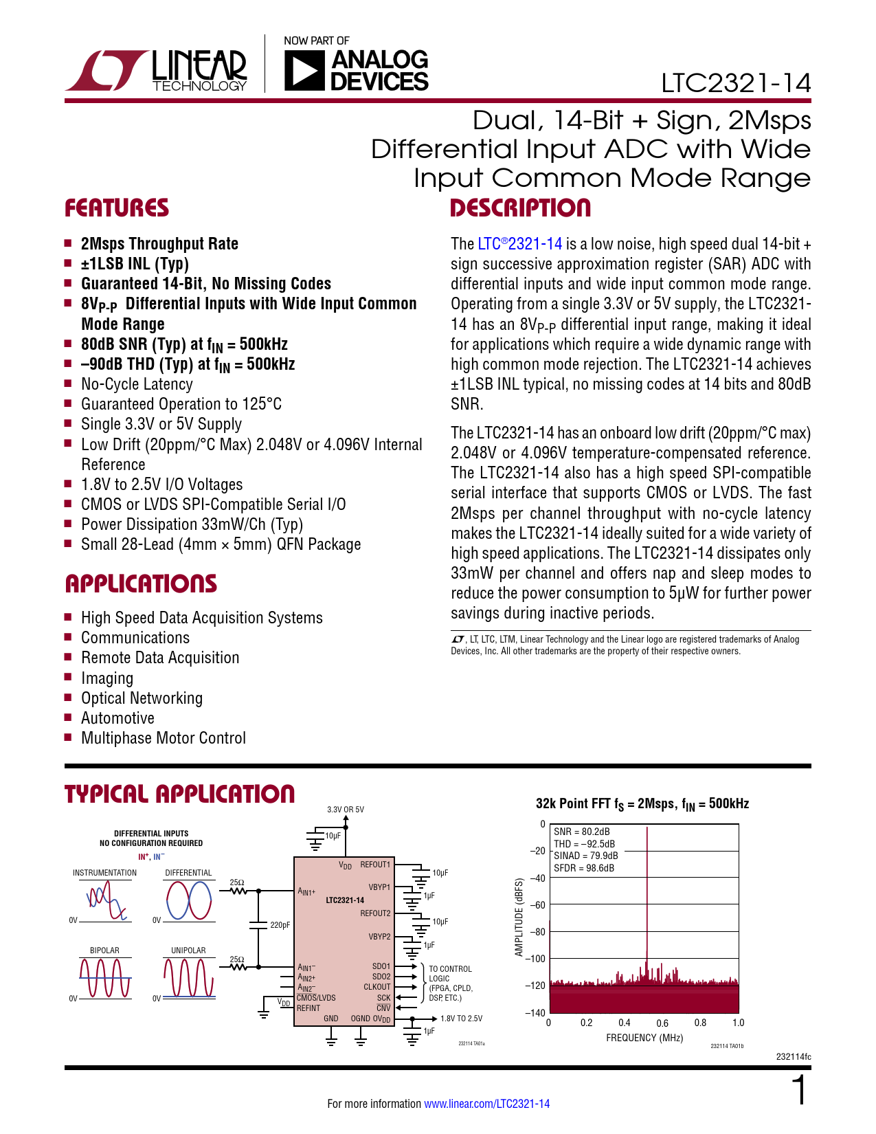 LTC2321-14 Dual, 14-Bit + Sign, 2Msps Differential Input ADC with Wide Input Common Mode Range FeaTuresDescripTion n 2Msps Throughput Rate The LTC®2321-14 is a low noise, high speed dual 14-bit + n ±1LSB INL (Typ) sign successive approximation register (SAR) ADC with n Guaranteed 14-Bit, No Missing Codes differential inputs and wide input common mode range. n 8VP-P Differential Inputs with Wide Input Common Operating from a single 3.3V or 5V supply, the LTC2321- Mode Range 14 has an 8VP-P differential input range, making it ideal n 80dB SNR (Typ) at fIN = 500kHz for applications which require a wide dynamic range with n –90dB THD (Typ) at fIN = 500kHz high common mode rejection. The LTC2321-14 achieves n No-Cycle Latency ±1LSB INL typical, no missing codes at 14 bits and 80dB n Guaranteed Operation to 125°C SNR. n Single 3.3V or 5V Supply The LTC2321-14 has an onboard low drift (20ppm/°C max) n Low Drift (20ppm/°C Max) 2.048V or 4.096V Internal 2.048V or 4.096V temperature-compensated reference. Reference The LTC2321-14 also has a high speed SPI-compatible n 1.8V to 2.5V I/O Voltages serial interface that supports CMOS or LVDS. The fast n CMOS or LVDS SPI-Compatible Serial I/O 2Msps per channel throughput with no-cycle latency n Power Dissipation 33mW/Ch (Typ) makes the LTC2321-14 ideally suited for a wide variety of n Small 28-Lead (4mm × 5mm) QFN Package high speed applications. The LTC2321-14 dissipates only 33mW per channel and offers nap and sleep modes to applicaTions reduce the power consumption to 5μW for further power n savings during inactive periods. High Speed Data Acquisition Systems n Communications L, LT, LTC, LTM, Linear Technology and the Linear logo are registered trademarks of Analog Devices, Inc. All other trademarks are the property of their respective owners. n Remote Data Acquisition n Imaging n Optical Networking n Automotive n Multiphase Motor Control Typical applicaTion32k Point FFT f 3.3V OR 5V S = 2Msps, fIN = 500kHz 0 DIFFERENTIAL INPUTS 10µF SNR = 80.2dB NO CONFIGURATION REQUIRED THD = –92.5dB –20 IN+, IN– SINAD = 79.9dB VDD REFOUT1 SFDR = 98.6dB INSTRUMENTATION DIFFERENTIAL 10µF 25Ω –40 VBYP1 AIN1+ 1µF LTC2321-14 –60 REFOUT2 0V 0V 220pF 10µF VBYP2 –80 1µF BIPOLAR UNIPOLAR AMPLITUDE (dBFS) 25Ω –100 A SDO1 IN1– TO CONTROL AIN2+ SDO2 LOGIC AIN2– CLKOUT (FPGA, CPLD, –120 0V 0V V CMOS/LVDS SCK DSP, ETC.) DD REFINT CNV –140 GND OGND OVDD 1.8V TO 2.5V 0 0.2 0.4 0.6 0.8 1.0 1µF FREQUENCY (MHz) 232114 TA01a 232114 TA01b 232114fc For more information www.linear.com/LTC2321-14 1 Document Outline Features Applications Typical Application Description Absolute Maximum Ratings Order Information Electrical Characteristics Pin Configuration Converter Characteristics Dynamic Accuracy Internal Reference Characteristics Digital Inputs And Digital Outputs Power Requirements ADC Timing Characteristics Typical Performance Characteristics Pin Functions Functional Block Diagram Timing Diagram Applications Information Typical Application Package Description Revision History Related Parts
