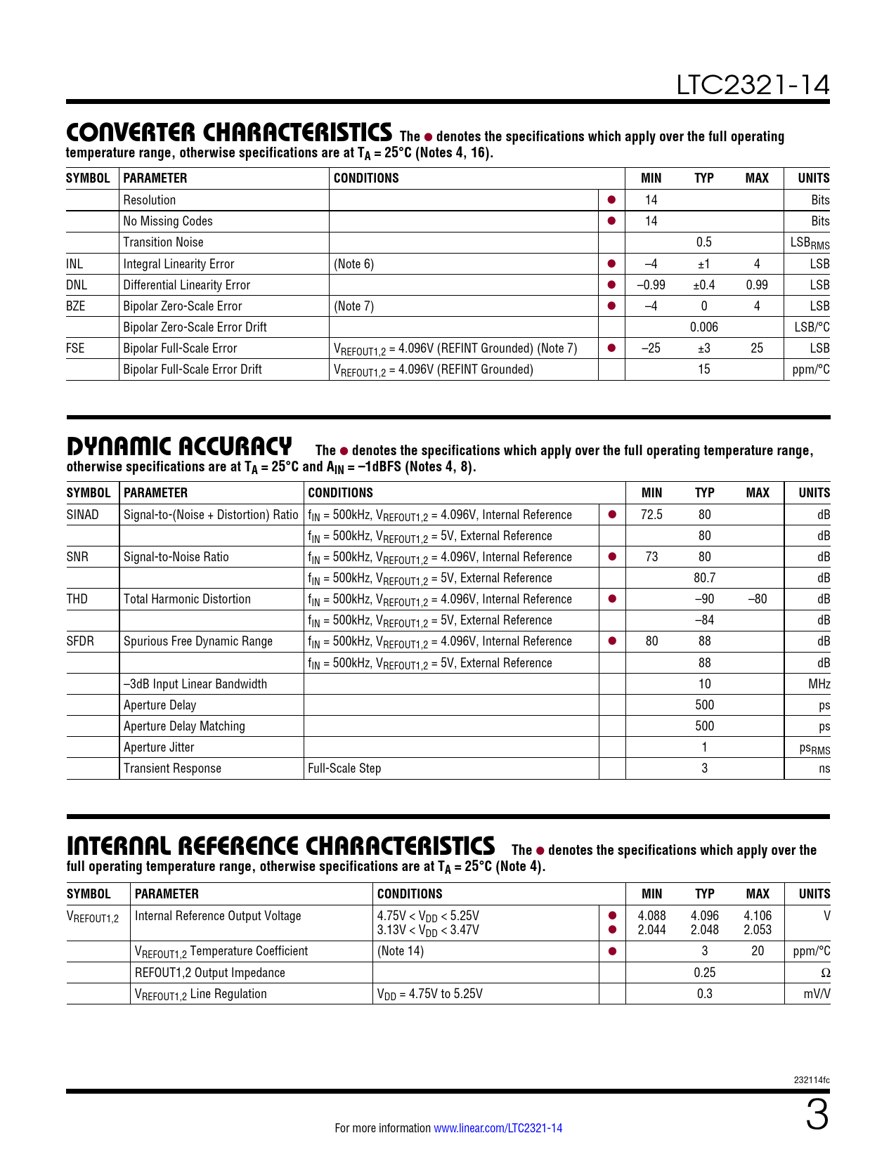 LTC2321-14 converTer characTerisTicsThe l denotes the specifications which apply over the full operatingtemperature range, otherwise specifications are at TA = 25°C (Notes 4, 16). SYMBOL PARAMETERCONDITIONSMINTYPMAXUNITS Resolution l 14 Bits No Missing Codes l 14 Bits Transition Noise 0.5 LSBRMS INL Integral Linearity Error (Note 6) l –4 ±1 4 LSB DNL Differential Linearity Error l –0.99 ±0.4 0.99 LSB BZE Bipolar Zero-Scale Error (Note 7) l –4 0 4 LSB Bipolar Zero-Scale Error Drift 0.006 LSB/°C FSE Bipolar Full-Scale Error VREFOUT1,2 = 4.096V (REFINT Grounded) (Note 7) l –25 ±3 25 LSB Bipolar Full-Scale Error Drift VREFOUT1,2 = 4.096V (REFINT Grounded) 15 ppm/°C DynaMic accuracyThe l denotes the specifications which apply over the full operating temperature range,otherwise specifications are at TA = 25°C and AIN = –1dBFS (Notes 4, 8). SYMBOL PARAMETERCONDITIONSMINTYPMAXUNITS SINAD Signal-to-(Noise + Distortion) Ratio fIN = 500kHz, VREFOUT1,2 = 4.096V, Internal Reference l 72.5 80 dB fIN = 500kHz, VREFOUT1,2 = 5V, External Reference 80 dB SNR Signal-to-Noise Ratio fIN = 500kHz, VREFOUT1,2 = 4.096V, Internal Reference l 73 80 dB fIN = 500kHz, VREFOUT1,2 = 5V, External Reference 80.7 dB THD Total Harmonic Distortion fIN = 500kHz, VREFOUT1,2 = 4.096V, Internal Reference l –90 –80 dB fIN = 500kHz, VREFOUT1,2 = 5V, External Reference –84 dB SFDR Spurious Free Dynamic Range fIN = 500kHz, VREFOUT1,2 = 4.096V, Internal Reference l 80 88 dB fIN = 500kHz, VREFOUT1,2 = 5V, External Reference 88 dB –3dB Input Linear Bandwidth 10 MHz Aperture Delay 500 ps Aperture Delay Matching 500 ps Aperture Jitter 1 psRMS Transient Response Full-Scale Step 3 ns inTernal reFerence characTerisTicsThe l denotes the specifications which apply over thefull operating temperature range, otherwise specifications are at TA = 25°C (Note 4). SYMBOLPARAMETERCONDITIONSMINTYPMAXUNITS VREFOUT1,2 Internal Reference Output Voltage 4.75V < VDD < 5.25V l 4.088 4.096 4.106 V 3.13V < VDD < 3.47V l 2.044 2.048 2.053 VREFOUT1,2 Temperature Coefficient (Note 14) l 3 20 ppm/°C REFOUT1,2 Output Impedance 0.25 Ω VREFOUT1,2 Line Regulation VDD = 4.75V to 5.25V 0.3 mV/V 232114fc For more information www.linear.com/LTC2321-14 3 Document Outline Features Applications Typical Application Description Absolute Maximum Ratings Order Information Electrical Characteristics Pin Configuration Converter Characteristics Dynamic Accuracy Internal Reference Characteristics Digital Inputs And Digital Outputs Power Requirements ADC Timing Characteristics Typical Performance Characteristics Pin Functions Functional Block Diagram Timing Diagram Applications Information Typical Application Package Description Revision History Related Parts