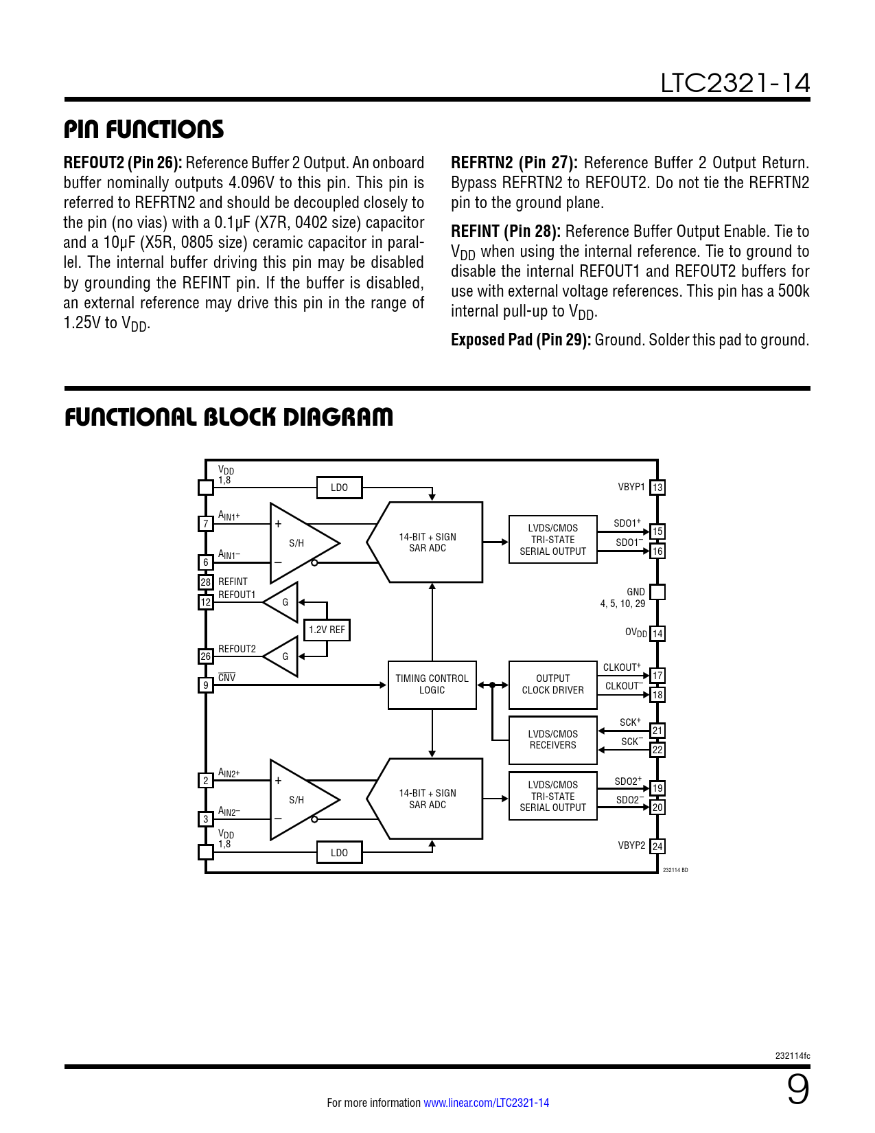 LTC2321-14 pin FuncTions REFOUT2 (Pin 26): Reference Buffer 2 Output. An onboard REFRTN2 (Pin 27): Reference Buffer 2 Output Return. buffer nominally outputs 4.096V to this pin. This pin is Bypass REFRTN2 to REFOUT2. Do not tie the REFRTN2 referred to REFRTN2 and should be decoupled closely to pin to the ground plane. the pin (no vias) with a 0.1µF (X7R, 0402 size) capacitor REFINT (Pin 28): Reference Buffer Output Enable. Tie to and a 10μF (X5R, 0805 size) ceramic capacitor in paral- V lel. The internal buffer driving this pin may be disabled DD when using the internal reference. Tie to ground to disable the internal REFOUT1 and REFOUT2 buffers for by grounding the REFINT pin. If the buffer is disabled, use with external voltage references. This pin has a 500k an external reference may drive this pin in the range of internal pull-up to V 1.25V to V DD. DD. Exposed Pad (Pin 29): Ground. Solder this pad to ground. FuncTional block DiagraM VDD 1,8 LDO VBYP1 13 AIN1+ 7 + LVDS/CMOS SDO1+ 15 14-BIT + SIGN TRI-STATE S/H SAR ADC SDO1– A SERIAL OUTPUT 16 IN1– 6 – 28 REFINT REFOUT1 GND 12 G 4, 5, 10, 29 1.2V REF OVDD 14 REFOUT2 26 G CLKOUT+ CNV TIMING CONTROL OUTPUT 17 9 LOGIC CLOCK DRIVER CLKOUT– 18 SCK+ LVDS/CMOS 21 RECEIVERS SCK– 22 A 2 IN2+ + LVDS/CMOS SDO2+ 19 14-BIT + SIGN TRI-STATE S/H SAR ADC SDO2– A SERIAL OUTPUT 20 IN2– 3 – VDD 1,8 VBYP2 24 LDO 232114 BD 232114fc For more information www.linear.com/LTC2321-14 9 Document Outline Features Applications Typical Application Description Absolute Maximum Ratings Order Information Electrical Characteristics Pin Configuration Converter Characteristics Dynamic Accuracy Internal Reference Characteristics Digital Inputs And Digital Outputs Power Requirements ADC Timing Characteristics Typical Performance Characteristics Pin Functions Functional Block Diagram Timing Diagram Applications Information Typical Application Package Description Revision History Related Parts