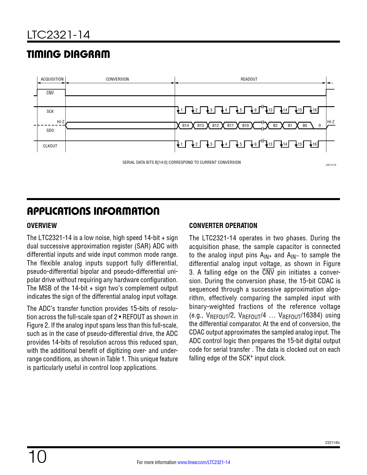 ACQUISITION CONVERSION READOUT CNV 1 2 3 4 5 6 13 14 15 16 SCK HI-Z HI-Z B14 B13 B12 B11 B10 B2 B1 B0 0 SDO CLKOUT 1 2 3 4 5 6 13 14 15 16 SERIAL DATA BITS B[14:0] CORRESPOND TO CURRENT CONVERSION 232114 TD