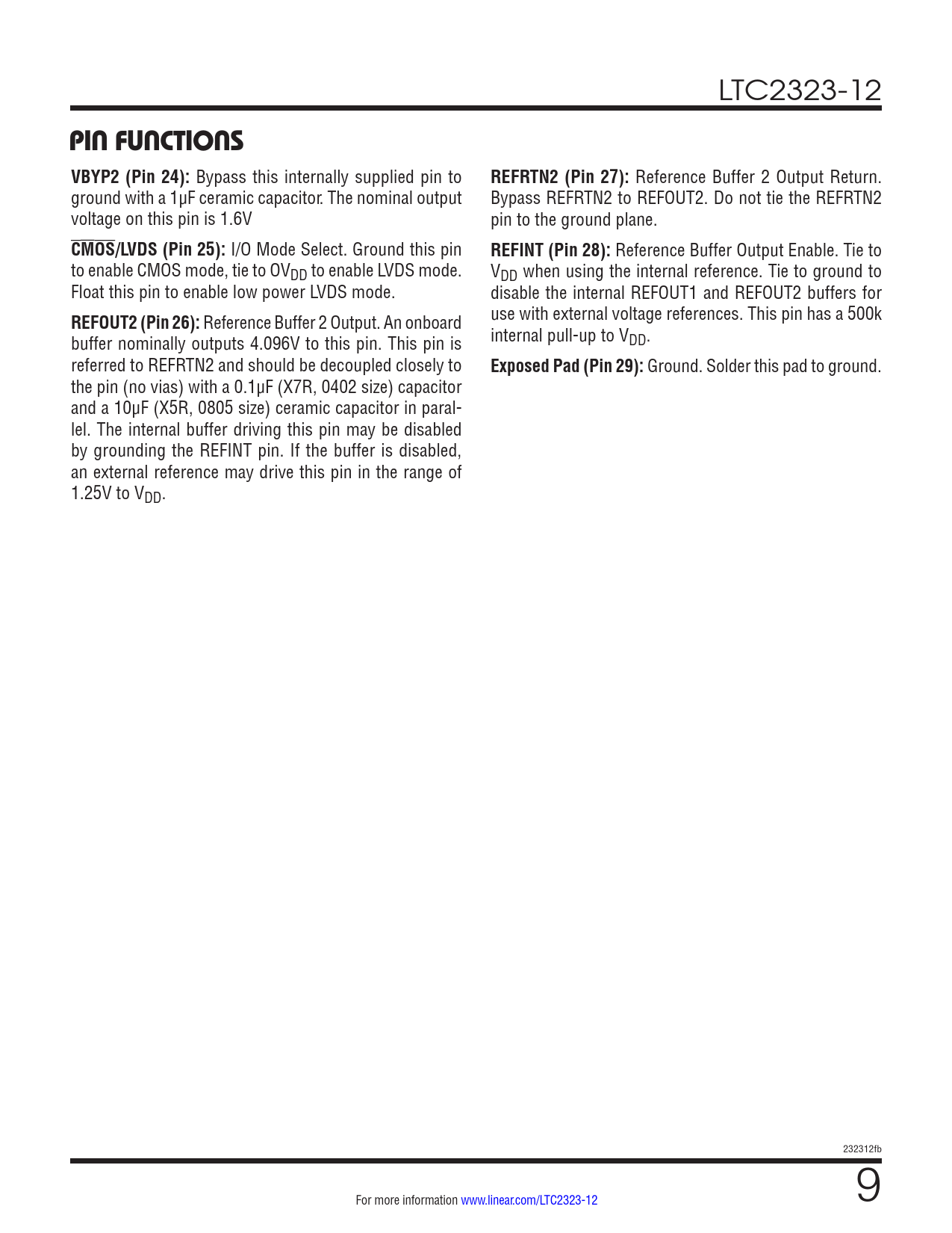 PIN FUNCTIONS. VBYP2 (Pin 24):. REFRTN2 (Pin 27):. CMOS/LVDS (Pin 25):. REFINT (Pin 28):. REFOUT2 (Pin 26):. Exposed Pad (Pin 29):