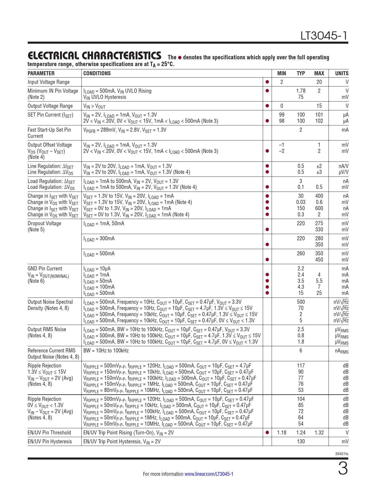 Input Voltage Range l 2 20 V Minimum IN Pin Voltage ILOAD = 500mA, VIN UVLO Rising l 1.78 2 V (Note 2) VIN UVLO Hysteresis 75 mV Output Voltage Range VIN > VOUT l 0 15 V SET Pin Current (ISET) VIN = 2V, ILOAD = 1mA, VOUT = 1.3V 99 100 101 µA 2V < VIN < 20V, 0V < VOUT < 15V, 1mA < ILOAD < 500mA (Note 3) l 98 100 102 µA Fast Start-Up Set Pin VPGFB = 289mV, VIN = 2.8V, VSET = 1.3V 2 mA Current Output Offset Voltage VIN = 2V, ILOAD = 1mA, VOUT = 1.3V –1 1 mV VOS (VOUT – VSET) 2V < VIN < 20V, 0V < VOUT < 15V, 1mA < ILOAD < 500mA (Note 3) l –2 2 mV (Note 4) Line Regulation: ∆ISET VIN = 2V to 20V, ILOAD = 1mA, VOUT = 1.3V l 0.5 ±2 nA/V Line Regulation: ∆VOS VIN = 2V to 20V, ILOAD = 1mA, VOUT = 1.3V (Note 4) l 0.5 ±3 µV/V Load Regulation: ∆ISET ILOAD = 1mA to 500mA, VIN = 2V, VOUT = 1.3V 3 nA Load Regulation: ∆VOS ILOAD = 1mA to 500mA, VIN = 2V, VOUT = 1.3V (Note 4) l 0.1 0.5 mV Change in ISET with VSET VSET = 1.3V to 15V, VIN = 20V, ILOAD = 1mA l 30 400 nA Change in VOS with VSET VSET = 1.3V to 15V, VIN = 20V, ILOAD = 1mA (Note 4) l 0.03 0.6 mV Change in ISET with VSET VSET = 0V to 1.3V, VIN = 20V, ILOAD = 1mA l 150 600 nA Change in VOS with VSET VSET = 0V to 1.3V, VIN = 20V, ILOAD = 1mA (Note 4) l 0.3 2 mV Dropout Voltage ILOAD = 1mA, 50mA 220 275 mV (Note 5) l 330 mV ILOAD = 300mA 220 280 mV l 350 mV ILOAD = 500mA 260 350 mV l 450 mV GND Pin Current ILOAD = 10µA 2.2 mA VIN = VOUT(NOMINAL) ILOAD = 1mA l 2.4 4 mA (Note 6) ILOAD = 50mA l 3.5 5.5 mA ILOAD = 100mA l 4.3 7 mA ILOAD = 500mA l 15 25 mA Output Noise Spectral ILOAD = 500mA, Frequency = 10Hz, COUT = 10µF, CSET = 0.47µF, VOUT = 3.3V 500 nV/√Hz Density (Notes 4, 8) ILOAD = 500mA, Frequency = 10Hz, COUT = 10µF, CSET = 4.7µF, 1.3V ≤ VOUT ≤ 15V 70 nV/√Hz ILOAD = 500mA, Frequency = 10kHz, COUT = 10µF, CSET = 0.47µF, 1.3V ≤ VOUT ≤ 15V 2 nV/√Hz ILOAD = 500mA, Frequency = 10kHz, COUT = 10µF, CSET = 0.47µF, 0V ≤ VOUT < 1.3V 5 nV/√Hz Output RMS Noise ILOAD = 500mA, BW = 10Hz to 100kHz, COUT = 10µF, CSET = 0.47µF, VOUT = 3.3V 2.5 µVRMS (Notes 4, 8) ILOAD = 500mA, BW = 10Hz to 100kHz, COUT = 10µF, CSET = 4.7µF, 1.3V ≤ VOUT ≤ 15V 0.8 µVRMS ILOAD = 500mA, BW = 10Hz to 100kHz, COUT = 10µF, CSET = 4.7µF, 0V ≤ VOUT < 1.3V 1.8 µVRMS Reference Current RMS BW = 10Hz to 100kHz 6 nARMS Output Noise (Notes 4, 8) Ripple Rejection VRIPPLE = 500mVP-P, fRIPPLE = 120Hz, ILOAD = 500mA, COUT = 10µF, CSET = 4.7µF 117 dB 1.3V ≤ VOUT ≤ 15V VRIPPLE = 150mVP-P, fRIPPLE = 10kHz, ILOAD = 500mA, COUT = 10µF, CSET = 0.47µF 90 dB VIN – VOUT = 2V (Avg) VRIPPLE = 150mVP-P, fRIPPLE = 100kHz, ILOAD = 500mA, COUT = 10µF, CSET = 0.47µF 77 dB (Notes 4, 8) VRIPPLE = 150mVP-P, fRIPPLE = 1MHz, ILOAD = 500mA, COUT = 10µF, CSET = 0.47µF 76 dB VRIPPLE = 80mVP-P, fRIPPLE = 10MHz, ILOAD = 500mA, COUT = 10µF, CSET = 0.47µF 53 dB Ripple Rejection VRIPPLE = 500mVP-P, fRIPPLE = 120Hz, ILOAD = 500mA, COUT = 10µF, CSET = 0.47µF 104 dB 0V ≤ VOUT < 1.3V VRIPPLE = 50mVP-P, fRIPPLE = 10kHz, ILOAD = 500mA, COUT = 10µF, CSET = 0.47µF 85 dB VIN – VOUT = 2V (Avg) VRIPPLE = 50mVP-P, fRIPPLE = 100kHz, ILOAD = 500mA, COUT = 10µF, CSET = 0.47µF 72 dB (Notes 4, 8) VRIPPLE = 50mVP-P, fRIPPLE = 1MHz, ILOAD = 500mA, COUT = 10µF, CSET = 0.47µF 64 dB VRIPPLE = 50mVP-P, fRIPPLE = 10MHz, ILOAD = 500mA, COUT = 10µF, CSET = 0.47µF 54 dB EN/UV Pin Threshold EN/UV Trip Point Rising (Turn-On), VIN = 2V l 1.18 1.24 1.32 V EN/UV Pin Hysteresis EN/UV Trip Point Hysteresis, VIN = 2V 130 mV 30451fa For more information www.linear.com/LT3045-1 3 Document Outline Features Applications Typical Application Description Absolute Maximum Ratings Pin Configuration Order Information Electrical Characteristics Typical Performance Characteristics Pin Functions Block Diagram Applications Information Typical Applications Package Description Revision History Typical Application Related Parts
