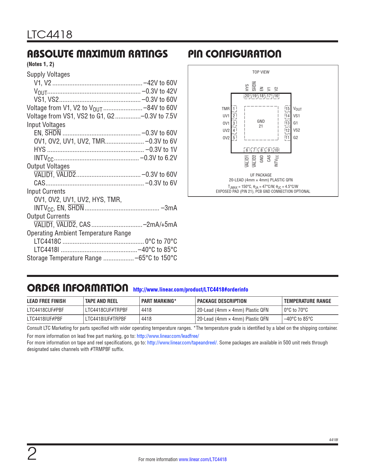 LTC4418 ABSOLUTE MAXIMUM RATINGSPIN CONFIGURATION(Notes 1, 2) Supply Voltages TOP VIEW V1, V2 ... –42V to 60V VOUT... –0.3V to 42V HYS SHDN EN V1 V2 VS1, VS2 .. –0.3V to 60V 20 19 18 17 16 Voltage from V1, V2 to VOUT ... –84V to 60V TMR 1 15 VOUT Voltage from VS1, VS2 to G1, G2 ...–0.3V to 7.5V UV1 2 14 VS1 Input Voltages GND OV1 3 13 G1 21 EN, SHDN .. –0.3V to 60V UV2 4 12 VS2 OV1, OV2, UV1, UV2, TMR... –0.3V to 6V OV2 5 11 G2 HYS ... –0.3V to 1V 6 7 8 9 10 INTVCC .. –0.3V to 6.2V V CC Output Voltages VALID1 VALID2 GND CAS INT VALID1, VALID2 .. –0.3V to 60V UF PACKAGE CAS .. –0.3V to 6V 20-LEAD (4mm × 4mm) PLASTIC QFN T Input Currents JMAX = 150°C, θJA = 47°C/W, θJC = 4.5°C/W EXPOSED PAD (PIN 21), PCB GND CONNECTION OPTIONAL OV1, OV2, UV1, UV2, HYS, TMR, INTVCC, EN, SHDN .. –3mA Output Currents VALID1, VALID2, CAS ..–2mA/+5mA Operating Ambient Temperature Range LTC4418C .. 0°C to 70°C LTC4418I ...–40°C to 85°C Storage Temperature Range .. –65°C to 150°C ORDER INFORMATION http://www.linear.com/product/LTC4418#orderinfoLEAD FREE FINISHTAPE AND REELPART MARKING*PACKAGE DESCRIPTIONTEMPERATURE RANGE LTC4418CUF#PBF LTC4418CUF#TRPBF 4418 20-Lead (4mm × 4mm) Plastic QFN 0°C to 70°C LTC4418IUF#PBF LTC4418IUF#TRPBF 4418 20-Lead (4mm × 4mm) Plastic QFN –40°C to 85°C Consult LTC Marketing for parts specified with wider operating temperature ranges. *The temperature grade is identified by a label on the shipping container. For more information on lead free part marking, go to: http://www.linear.com/leadfree/ For more information on tape and reel specifications, go to: http://www.linear.com/tapeandreel/. Some packages are available in 500 unit reels through designated sales channels with #TRMPBF suffix. 4418f 2 For more information www.linear.com/LTC4418 Document Outline Features Applications Description Typical Application Absolute Maximum Ratings Pin Configuration Order Information Electrical Characteristics Typical Performance Characteristics Pin Functions Block Diagram Timing Diagram Operation Applications Information Typical Applications Package Description Typical Application Related Parts