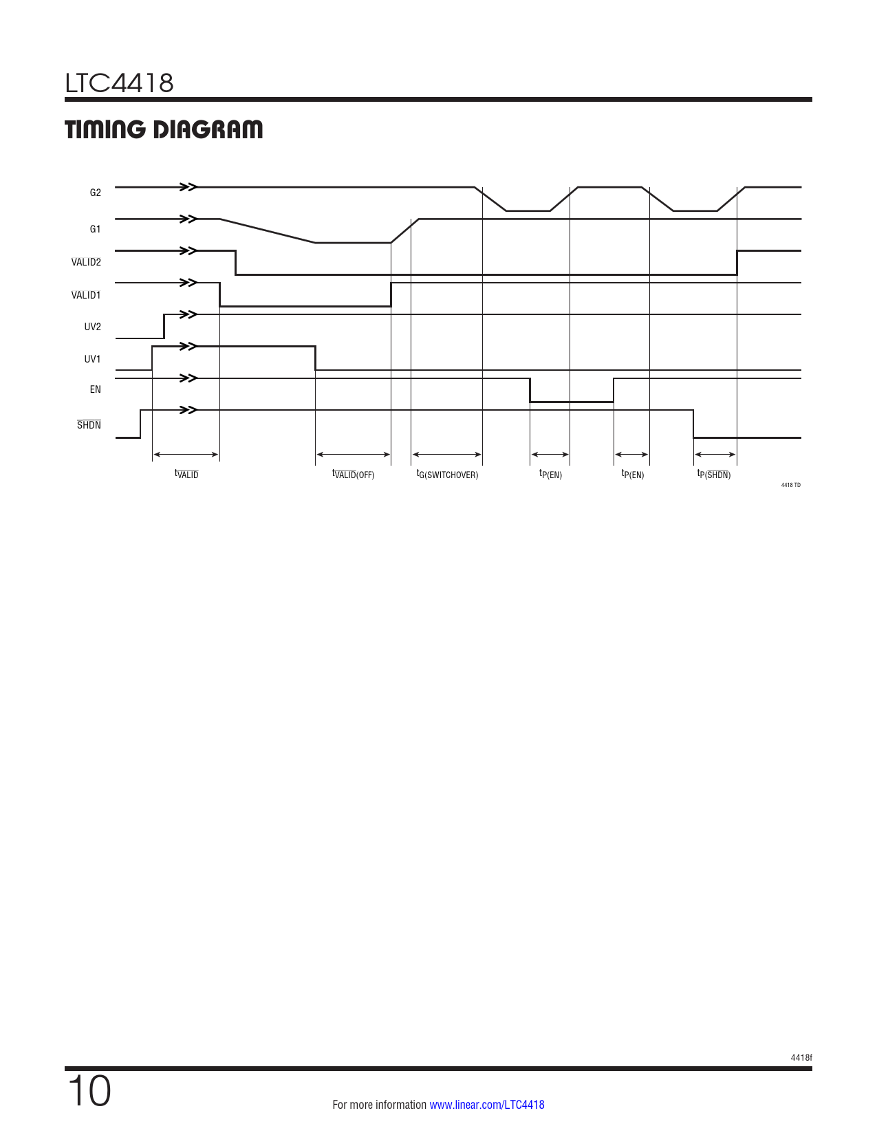 G2 G1 VALID2 VALID1 UV2 UV1 EN SHDN tVALID tVALID(OFF) tG(SWITCHOVER) tP(EN) tP(EN) tP(SHDN) 4418 TD 4418f 10 For more information www.linear.com/LTC4418 Document Outline Features Applications Description Typical Application Absolute Maximum Ratings Pin Configuration Order Information Electrical Characteristics Typical Performance Characteristics Pin Functions Block Diagram Timing Diagram Operation Applications Information Typical Applications Package Description Typical Application Related Parts