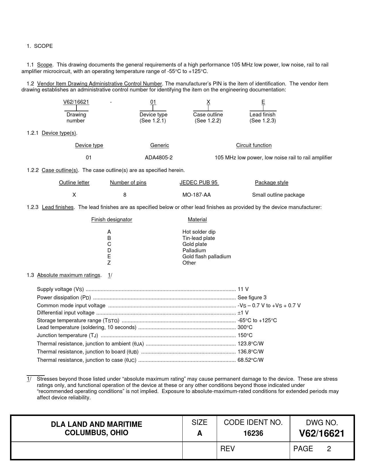 1. SCOPE 1.1 Scope. This drawing documents the general requirements of a high performance 105 MHz low power, low noise, rail to rail amplifier microcircuit, with an operating temperature range of -55C to +125C. 1.2 Vendor Item Drawing Administrative Control Number. The manufacturer’s PIN is the item of identification. The vendor item drawing establishes an administrative control number for identifying the item on the engineering documentation: V62/16621 - 01 X E Drawing Device type Case outline Lead finish number (See 1.2.1) (See 1.2.2) (See 1.2.3) 1.2.1 Device type(s). Device type Generic Circuit function 01 ADA4805-2 105 MHz low power, low noise rail to rail amplifier 1.2.2 Case outline(s). The case outline(s) are as specified herein. Outline letter Number of pins JEDEC PUB 95 Package style X 8 MO-187-AA Small outline package 1.2.3 Lead finishes. The lead finishes are as specified below or other lead finishes as provided by the device manufacturer: Finish designator Material A Hot solder dip B Tin-lead plate C Gold plate D Palladium E Gold flash palladium Z Other 1.3 Absolute maximum ratings. 1/ Supply voltage (VS) .. 11 V Power dissipation (PD) ... See figure 3 Common mode input voltage ... -VS – 0.7 V to +VS + 0.7 V Differential input voltage ... 1 V Storage temperature range (TSTG) .. -65C to +125C Lead temperature (soldering, 10 seconds) ... 300C Junction temperature (TJ) .. 150C Thermal resistance, junction to ambient (JA) .. 123.8C/W Thermal resistance, junction to board (JB) ... 136.8C/W Thermal resistance, junction to case (JC) ... 68.52C/W 1/ Stresses beyond those listed under “absolute maximum rating” may cause permanent damage to the device. These are stress ratings only, and functional operation of the device at these or any other conditions beyond those indicated under “recommended operating conditions” is not implied. Exposure to absolute-maximum-rated conditions for extended periods may affect device reliability.