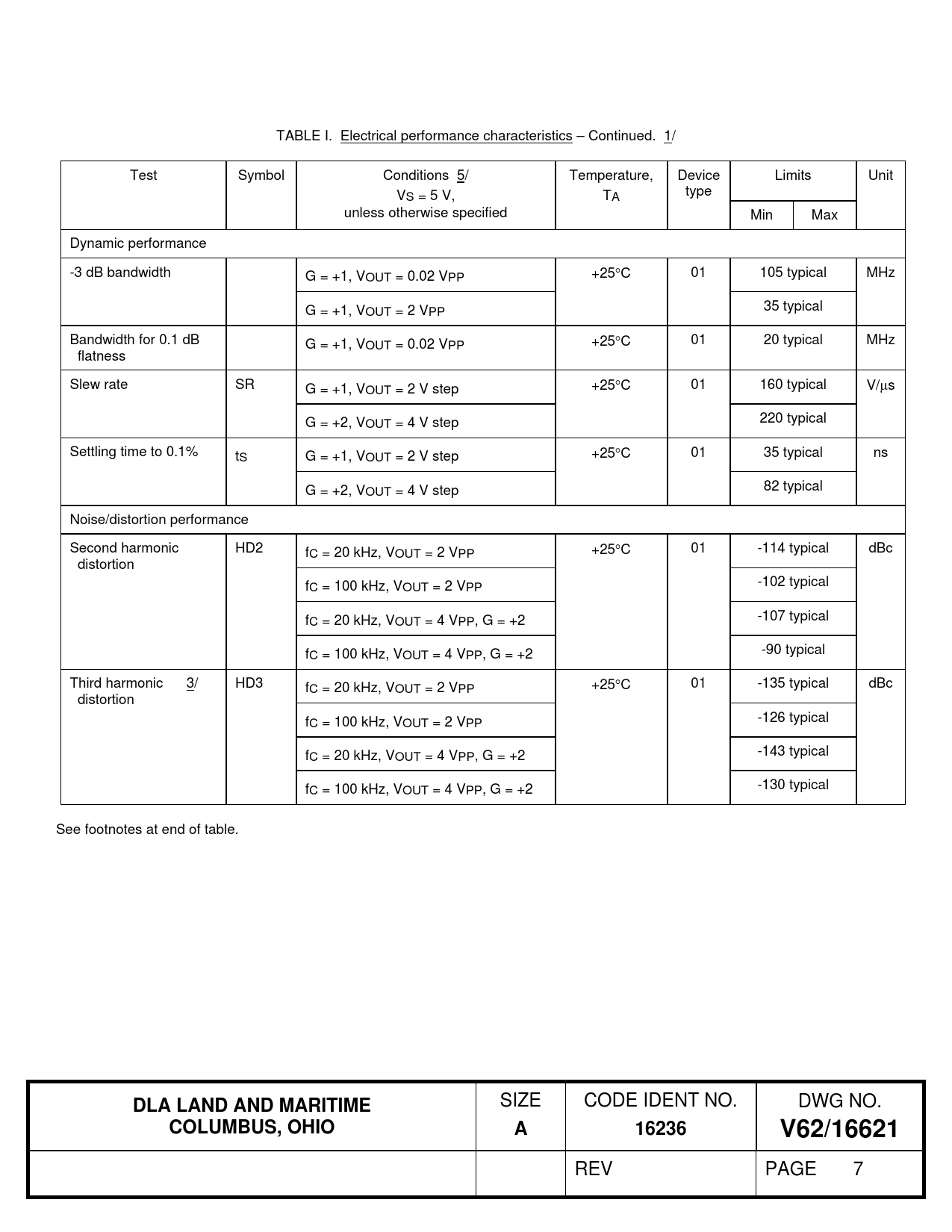 TABLE I. Electrical performance characteristics – Continued. 1/ Test Symbol Conditions 5/ Temperature, Device Limits Unit VS = 5 V, TA type unless otherwise specified Min Max Dynamic performance -3 dB bandwidth G = +1, VOUT = 0.02 VPP +25C 01 105 typical MHz G = +1, VOUT = 2 VPP 35 typical Bandwidth for 0.1 dB G = +1, VOUT = 0.02 VPP +25C 01 20 typical MHz flatness Slew rate SR G = +1, VOUT = 2 V step +25C 01 160 typical V/s G = +2, VOUT = 4 V step 220 typical Settling time to 0.1% tS G = +1, VOUT = 2 V step +25C 01 35 typical ns G = +2, VOUT = 4 V step 82 typical Noise/distortion performance Second harmonic HD2 fC = 20 kHz, VOUT = 2 VPP +25C 01 -114 typical dBc distortion fC = 100 kHz, VOUT = 2 VPP -102 typical fC = 20 kHz, VOUT = 4 VPP, G = +2 -107 typical fC = 100 kHz, VOUT = 4 VPP, G = +2 -90 typical Third harmonic 3/ HD3 fC = 20 kHz, VOUT = 2 VPP +25C 01 -135 typical dBc distortion fC = 100 kHz, VOUT = 2 VPP -126 typical fC = 20 kHz, VOUT = 4 VPP, G = +2 -143 typical fC = 100 kHz, VOUT = 4 VPP, G = +2 -130 typical See footnotes at end of table.