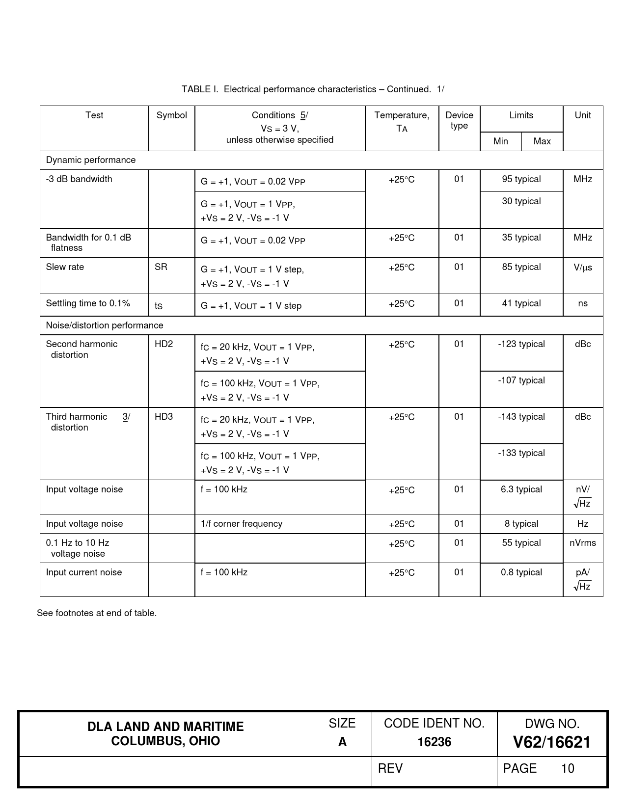 TABLE I. Electrical performance characteristics – Continued. 1/ Test Symbol Conditions 5/ Temperature, Device Limits Unit VS = 3 V, TA type unless otherwise specified Min Max Dynamic performance -3 dB bandwidth G = +1, VOUT = 0.02 VPP +25C 01 95 typical MHz G = +1, VOUT = 1 VPP, 30 typical +VS = 2 V, -VS = -1 V Bandwidth for 0.1 dB G = +1, VOUT = 0.02 VPP +25C 01 35 typical MHz flatness Slew rate SR G = +1, VOUT = 1 V step, +25C 01 85 typical V/s +VS = 2 V, -VS = -1 V Settling time to 0.1% tS G = +1, VOUT = 1 V step +25C 01 41 typical ns Noise/distortion performance Second harmonic HD2 fC = 20 kHz, VOUT = 1 VPP, +25C 01 -123 typical dBc distortion +VS = 2 V, -VS = -1 V fC = 100 kHz, VOUT = 1 VPP, -107 typical +VS = 2 V, -VS = -1 V Third harmonic 3/ HD3 fC = 20 kHz, VOUT = 1 VPP, +25C 01 -143 typical dBc distortion +VS = 2 V, -VS = -1 V fC = 100 kHz, VOUT = 1 VPP, -133 typical +VS = 2 V, -VS = -1 V Input voltage noise f = 100 kHz +25C 01 6.3 typical nV/ Hz Input voltage noise 1/f corner frequency +25C 01 8 typical Hz 0.1 Hz to 10 Hz +25C 01 55 typical nVrms voltage noise Input current noise f = 100 kHz +25C 01 0.8 typical pA/ Hz See footnotes at end of table.