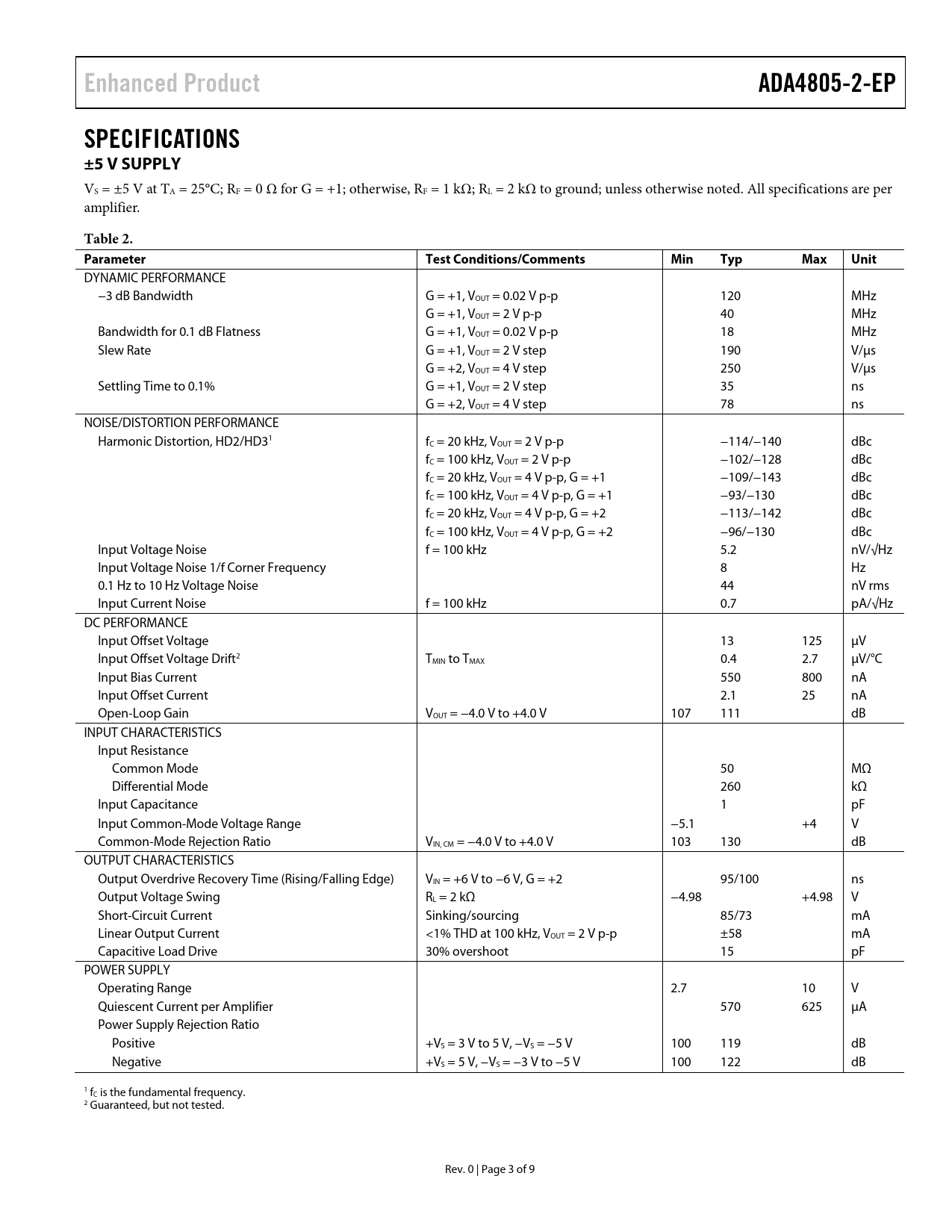 Enhanced Product. ADA4805-2-EP. SPECIFICATIONS ±5 V SUPPLY. Table 2. Parameter. Test Conditions/Comments. Min. Typ. Max. Unit