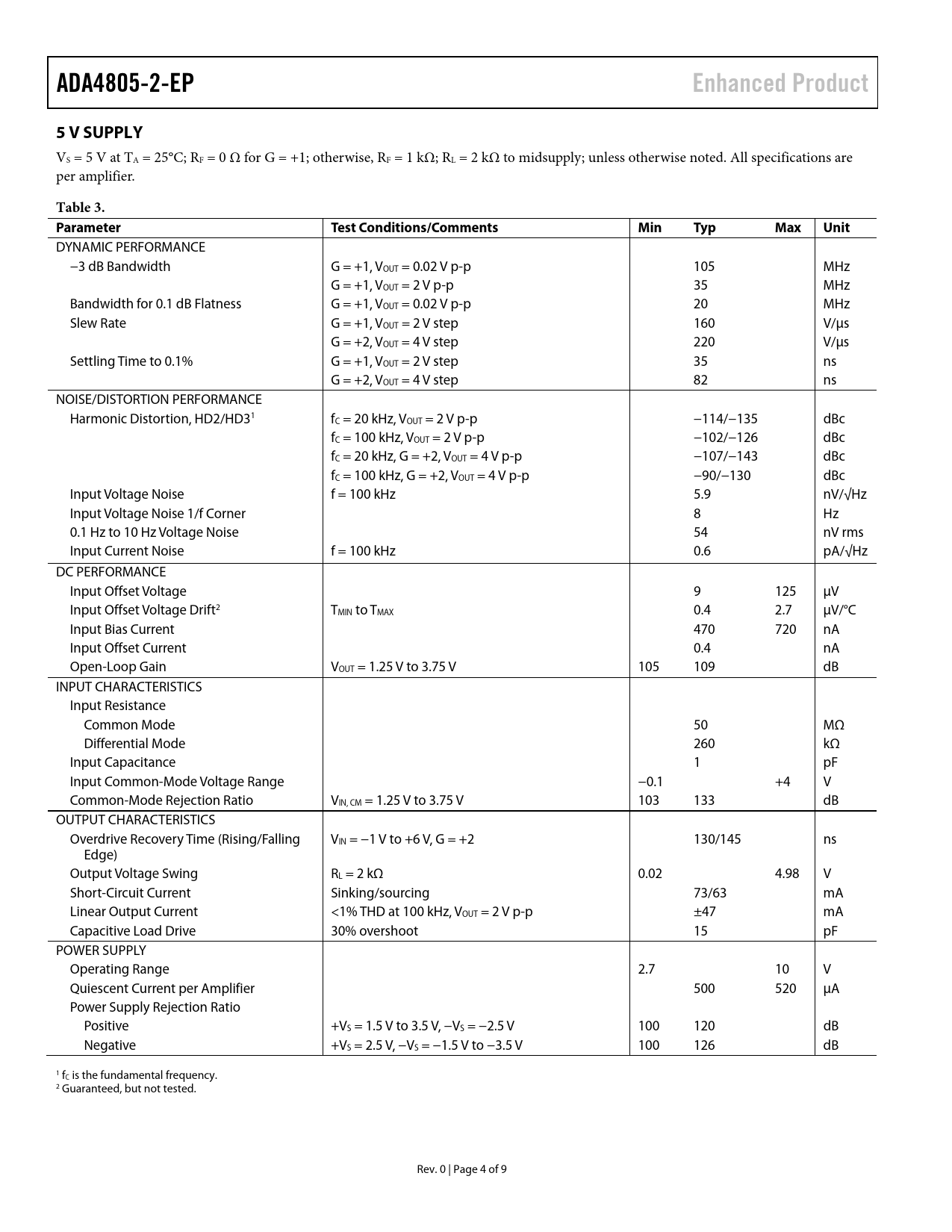 ADA4805-2-EP Enhanced Product 5 V SUPPLY Table 3 Parameter Test Conditions/Comments Min Typ Max Unit