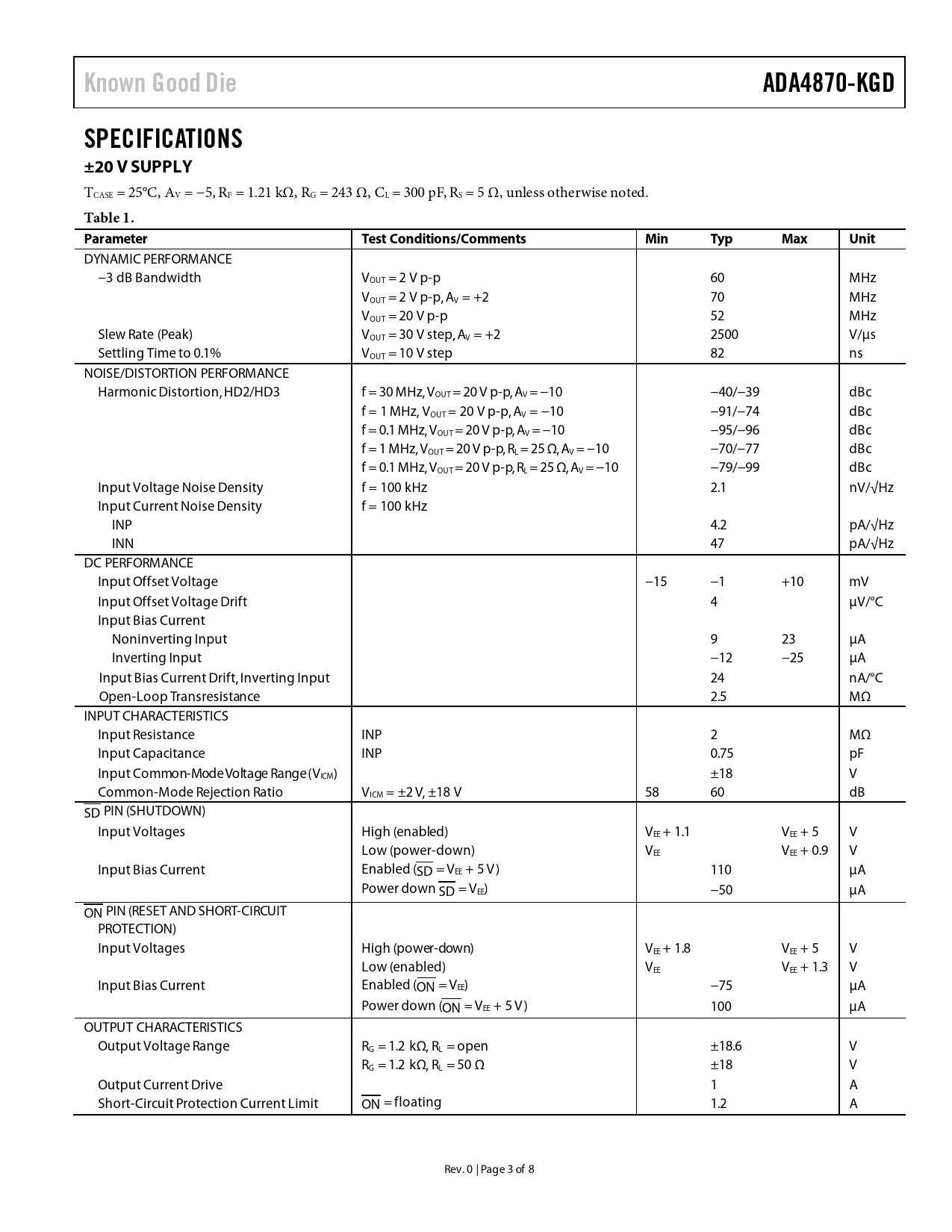 Pages / Page8 / 3 — Known Good Die. ADA4870-KGD. SPECIFICATIONS ±20 V SUPPLY. Table 1. …