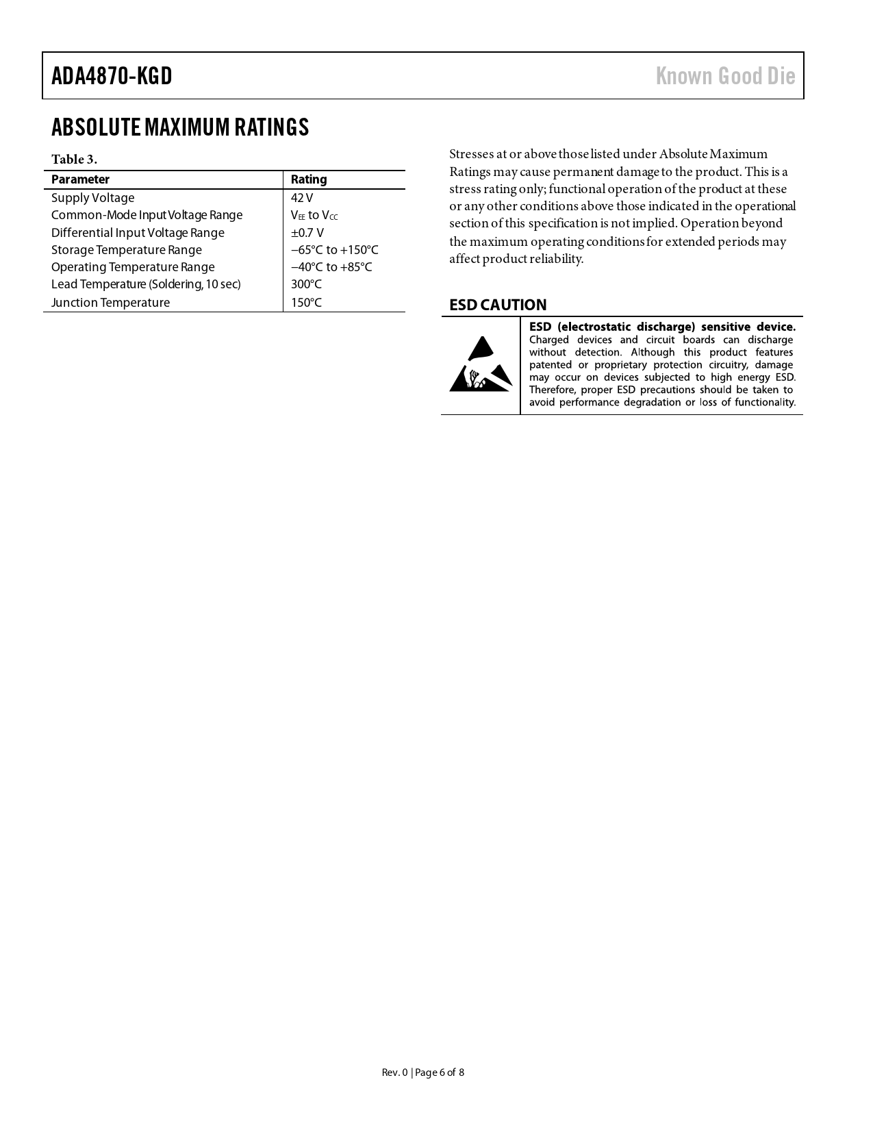 Pages / Page8 / 6 — ADA4870-KGD. Known Good Die. ABSOLUTE MAXIMUM RATINGS Table 3. Parameter. …